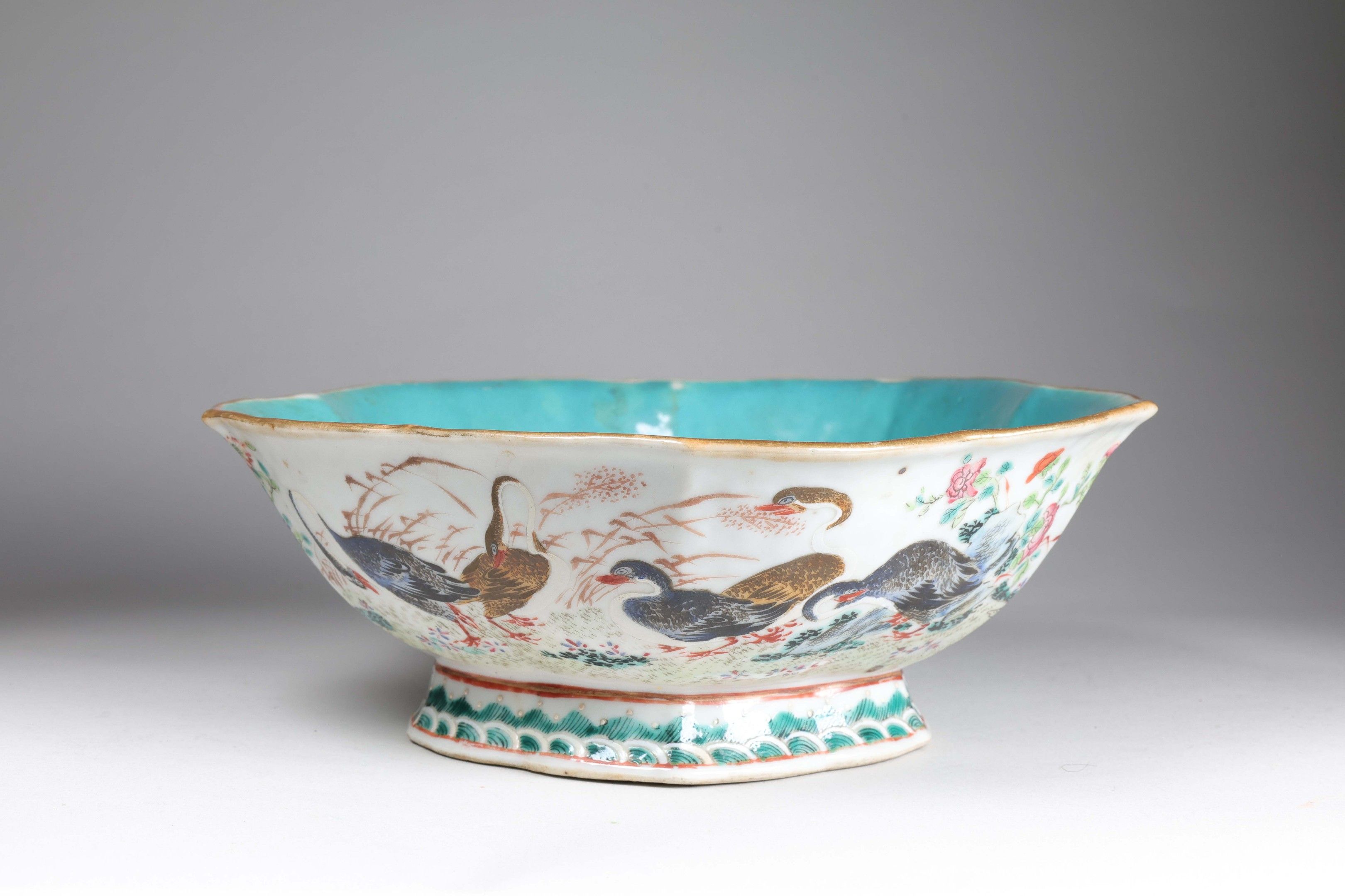 A porcelain bowl, standing on a short foot with a poly-lobed wall, decorated in polychrome enamels with pairs of ducks among flowering branches and a rock, the interior glazed in turquoise. A six-character Tongzhi mark stamped under the base.