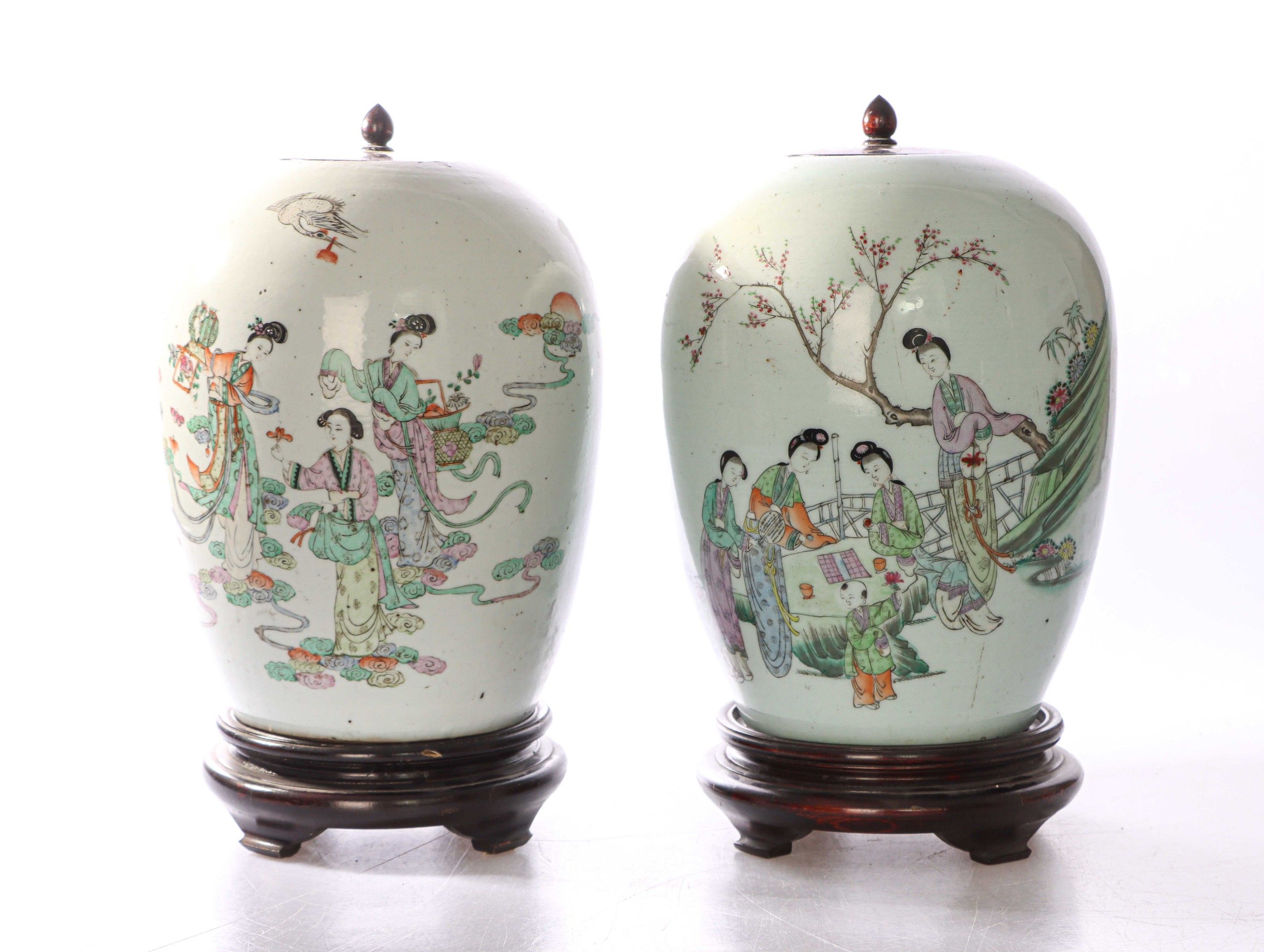 Two covered porcelain and enamel jars in the famille rose style decorated with young women in a garden and among ruyi clouds, inscriptions. Wooden lid. Marks under the bases.