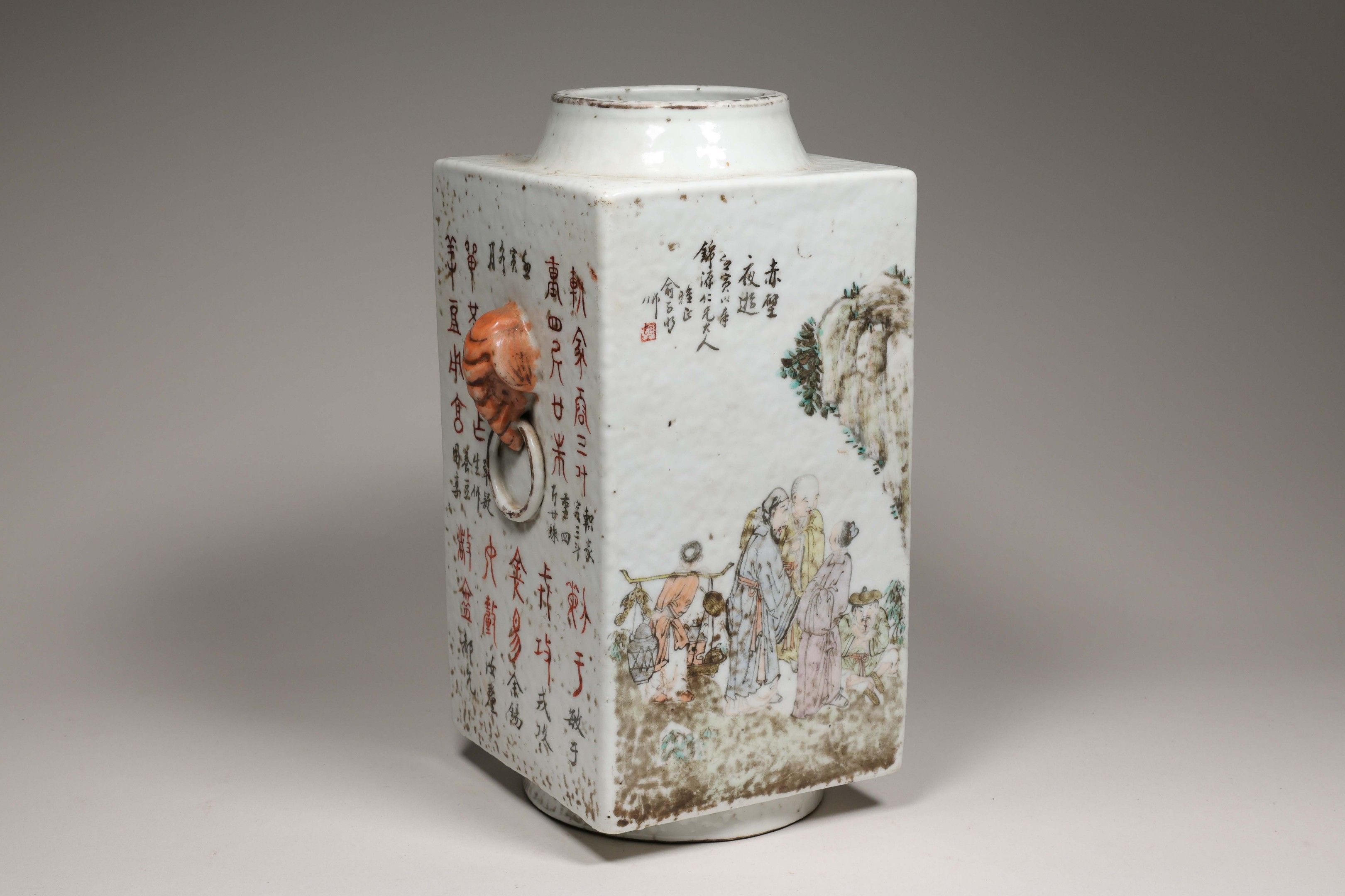 Porcelain vase, mounted on a short circular foot, with a quadrangular "cong" body, decorated in ciangjiang cai enamels with fishermen and poems, flanked by two handles in the form of elephant heads with rings. Signed Yu Ziming ().