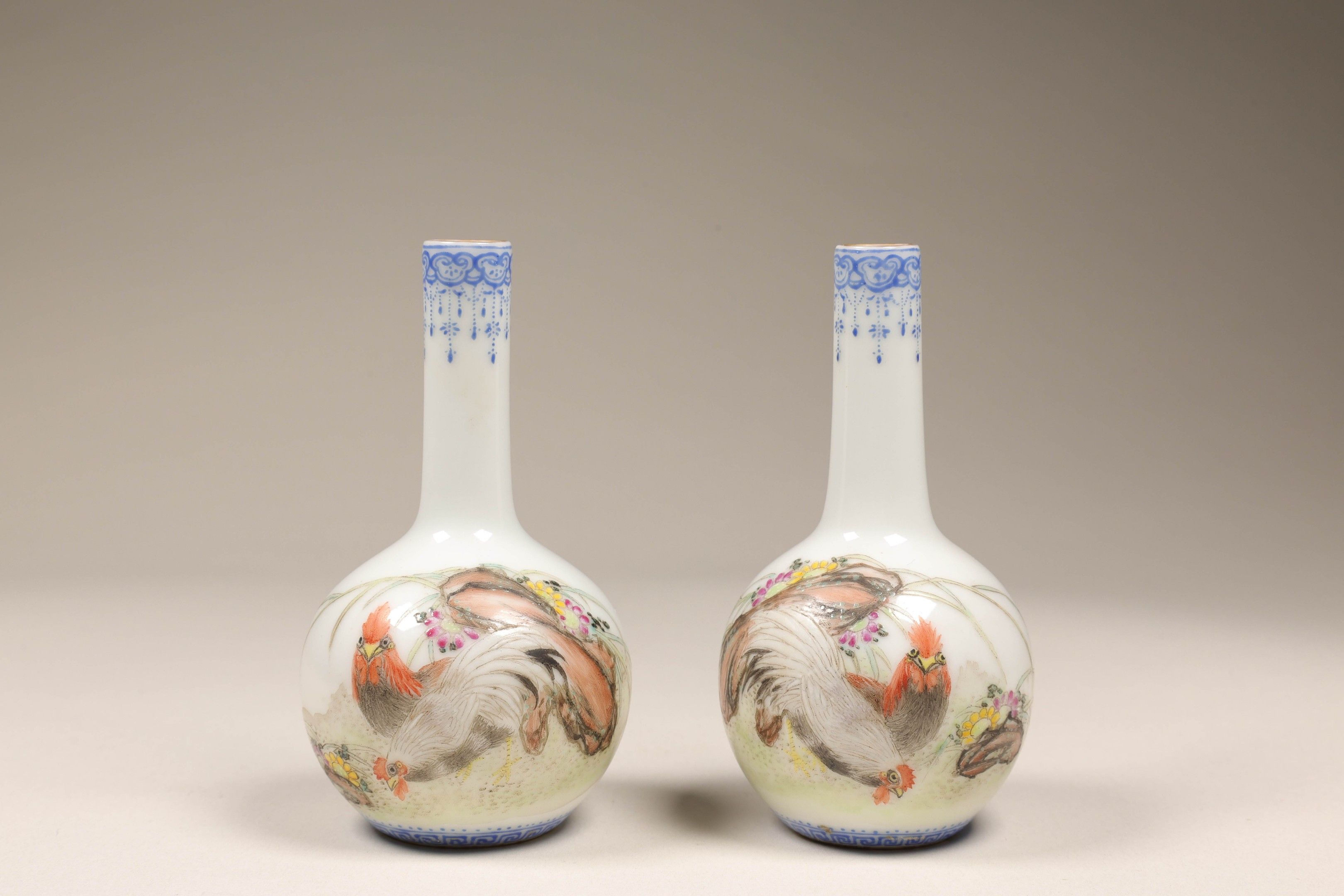 Pair of miniature porcelain vases, bottle-shaped, decorated in polychrome enamels with roosters, hens and their chicks among flowers and rocks, the scenes accompanied by poems reading :