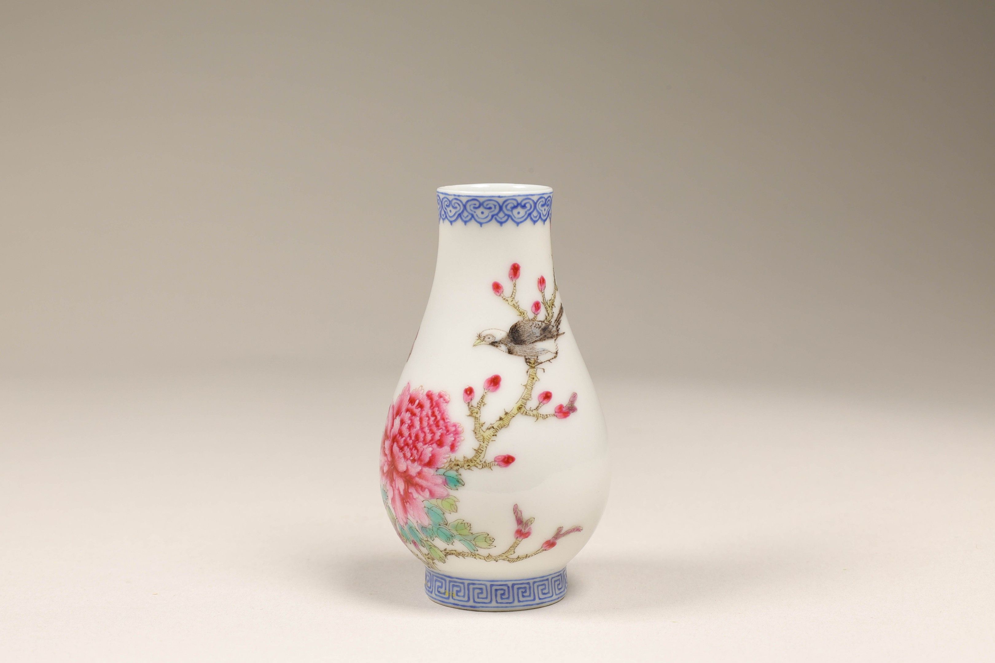 A baluster-shaped miniature porcelain vase decorated in polychrome enamels with a blackbird on a peony branch. A four-character "Le Gu Tang" ( ) mark under the base.