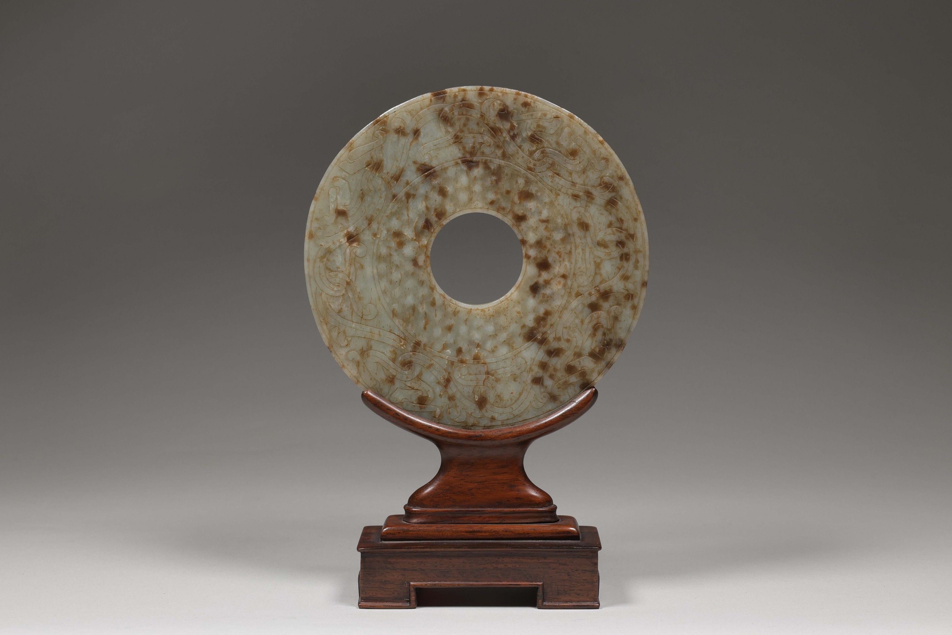 A jade bi disc, decorated in two concentric registers with a frieze of dots in relief on the inside and stylised kui dragons with intertwined bodies on the outside. The stone is in celadon tones flecked with brown.