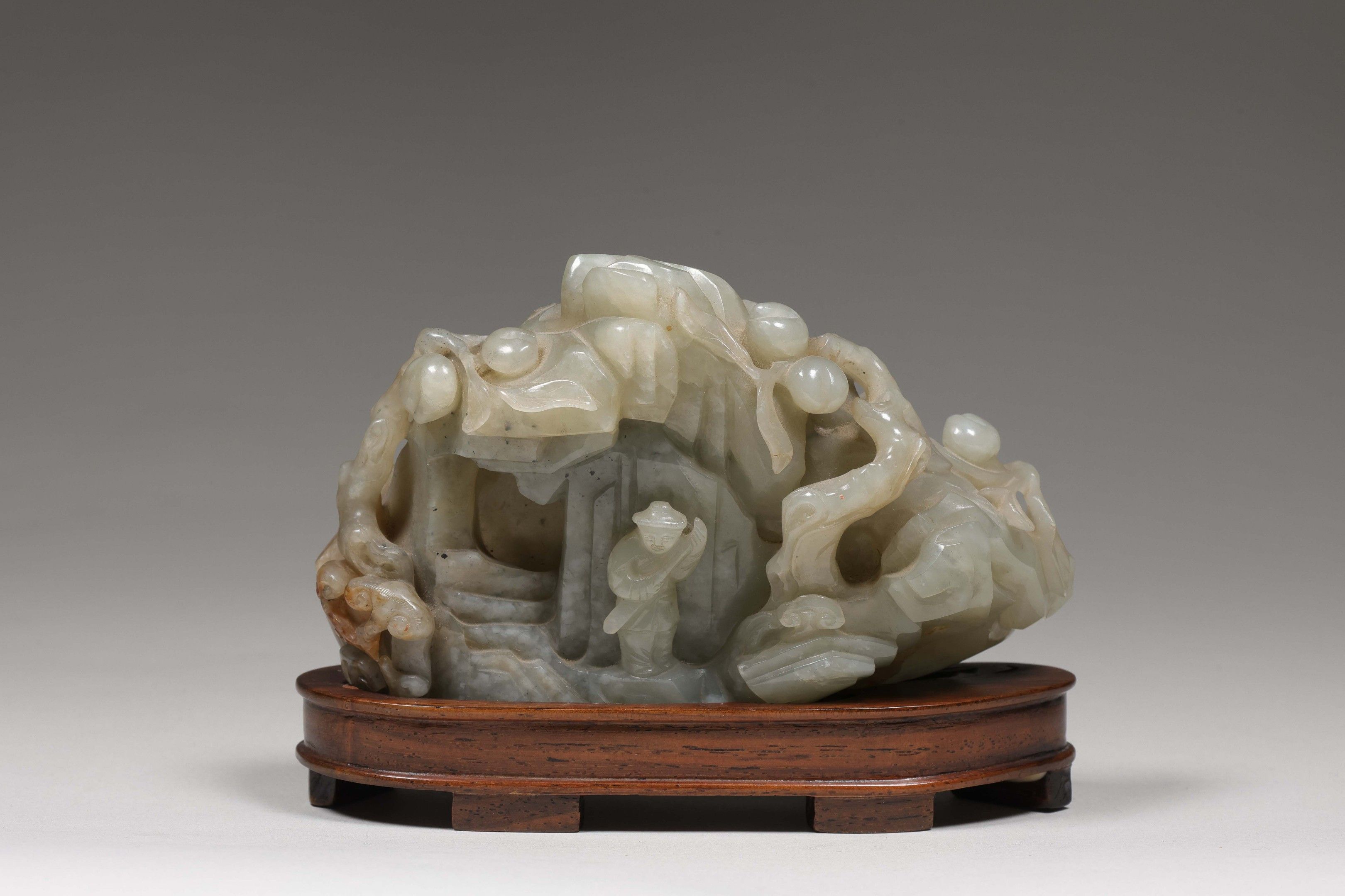 Rare group in grey jade, with high relief carved decoration in the form of a rock sheltering a standing figure holding a paddle, at the entrance to a cave on one side, a monkey climbing a rocky cliff on the other, the whole surmounted by branches of peach trees filled with fruit. The grey-toned stone has numerous white inclusions and is infused with rust in places.