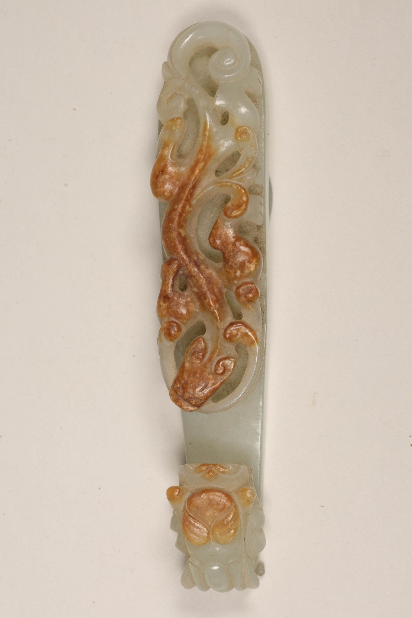 Celadon jade fibula in the form of a dragon surmounted by a raised qilong. The celadon-coloured stone is partially infused with light-brown rust, highlighting the details of the dragons in relief.