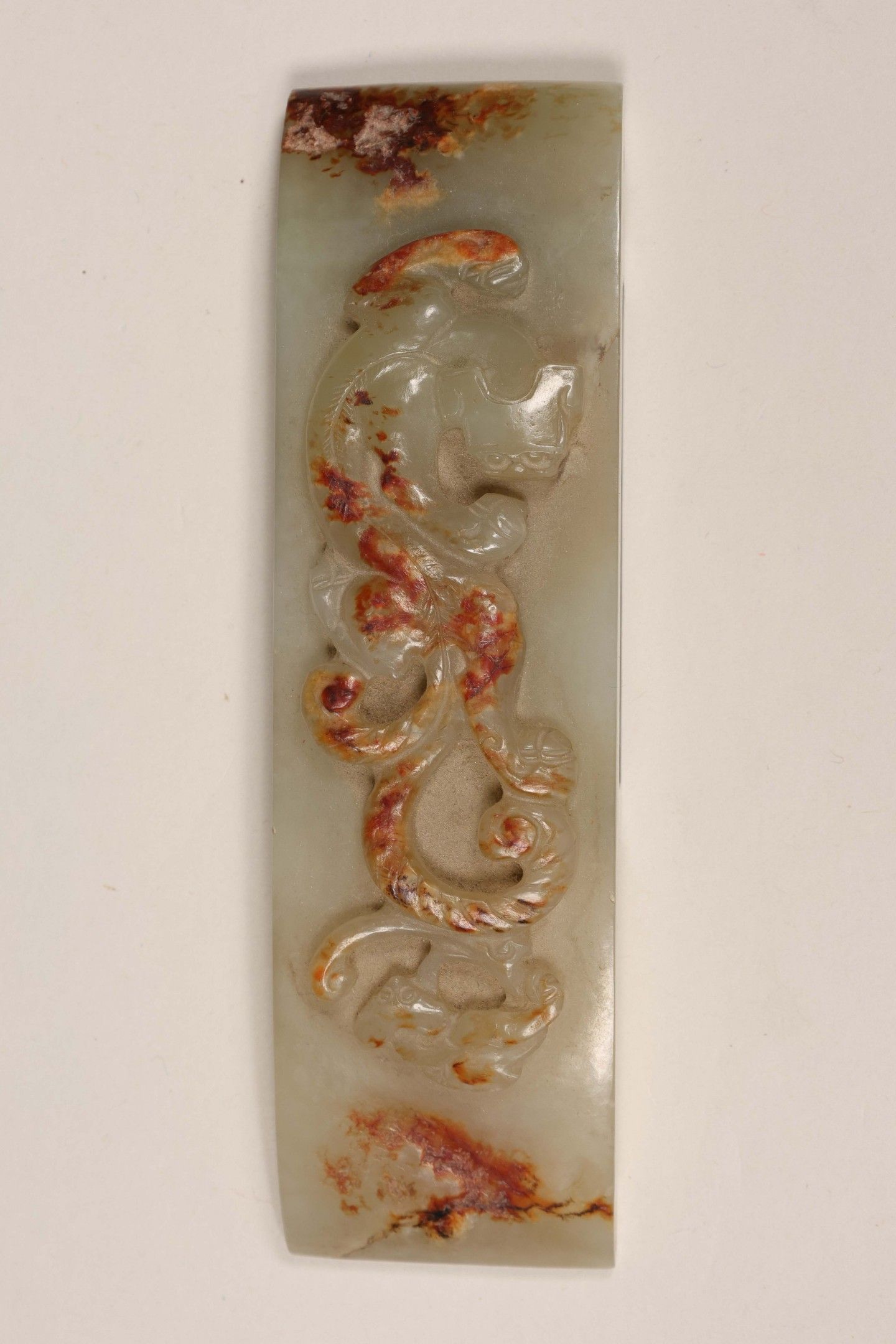A celadon jade fibula, rectangular in shape, surmounted by a qilong with its small one in relief. The celadon-coloured stone is partially infused with light-brown rust, highlighting the details of the dragons in relief.