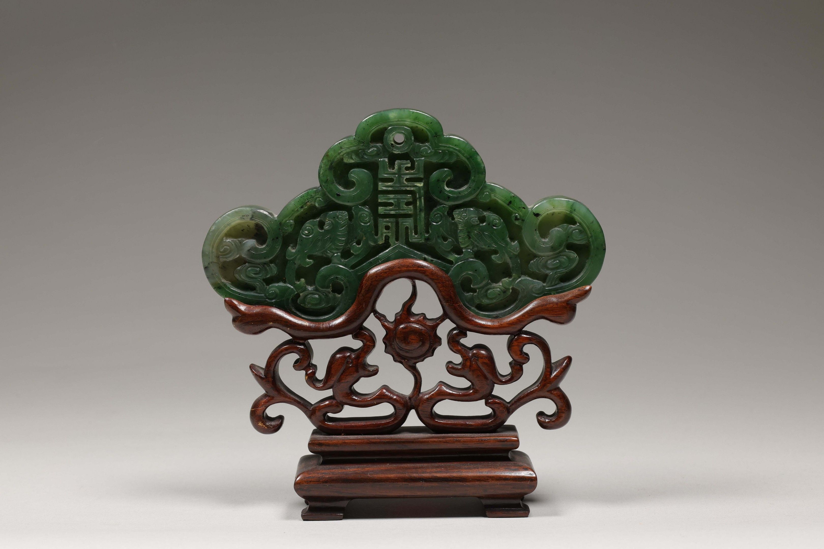Spinach jade plaque in the form of a lithophone stone, with relief decoration of bats moving through the clouds around a Shou character.