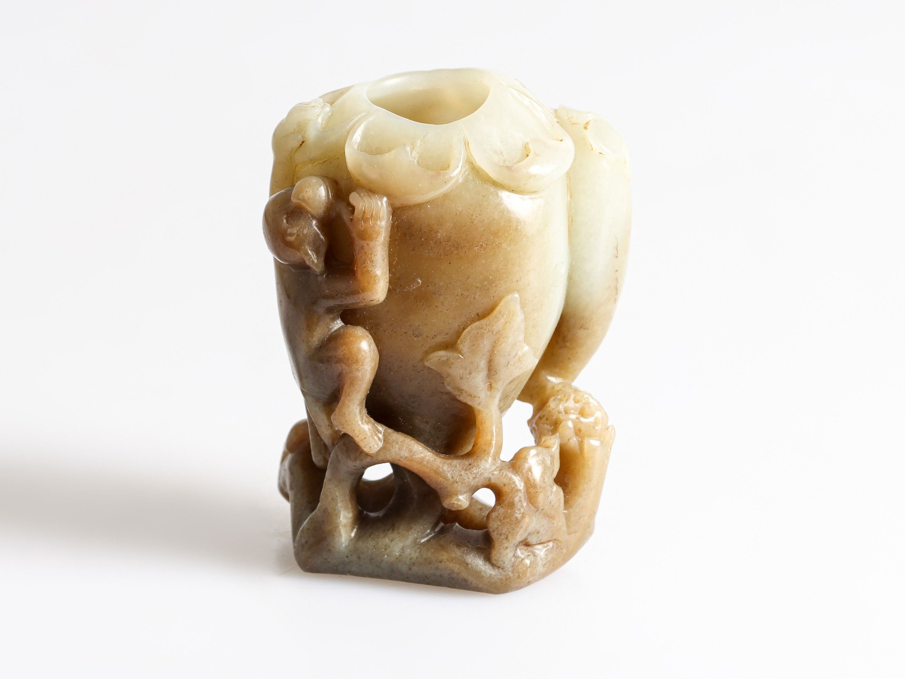 A jade water jug with carved decoration of a monkey and leafy branches with fruit.