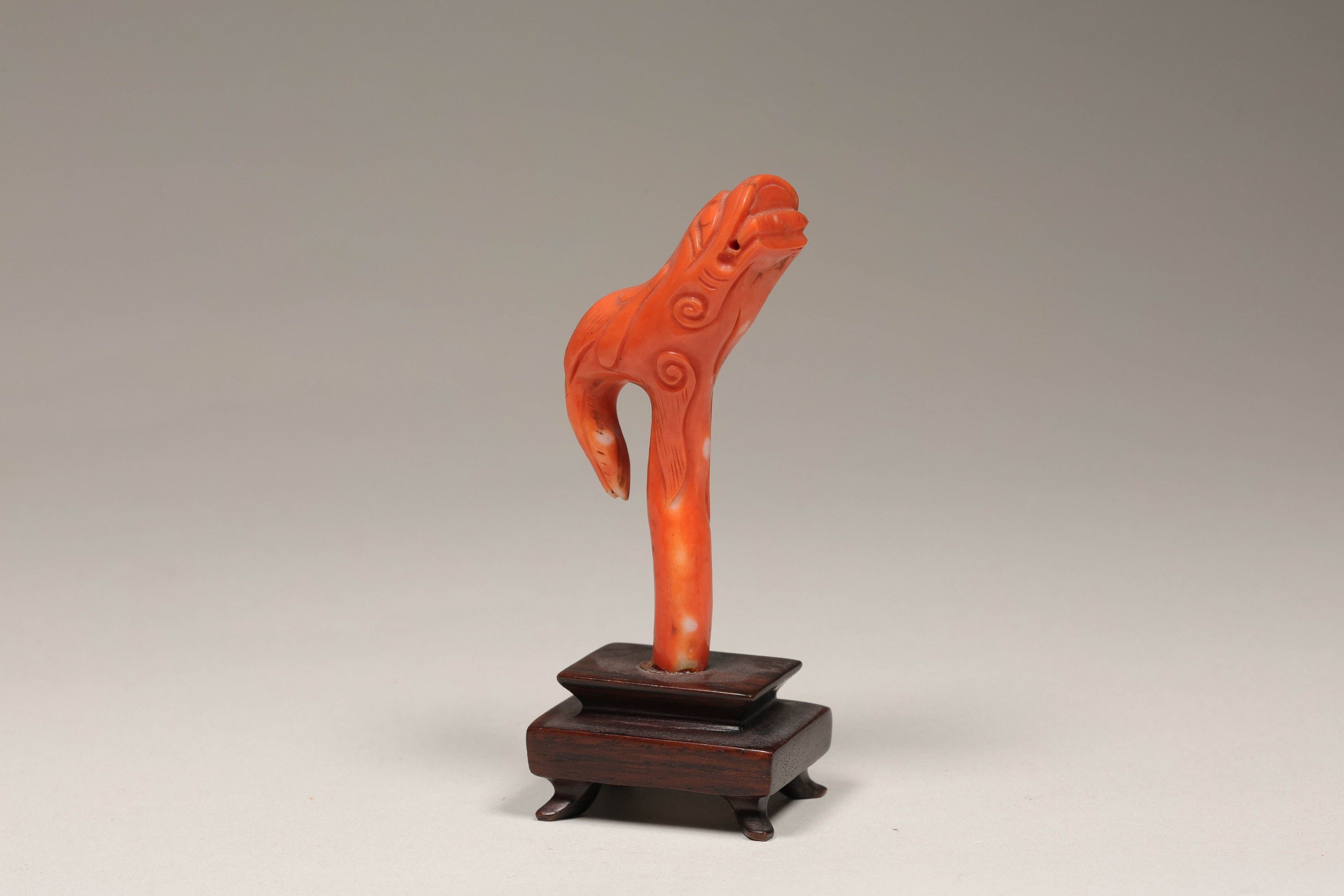 Carved orange* coral subject in the form of a stylised chimera. With adapted wooden base.