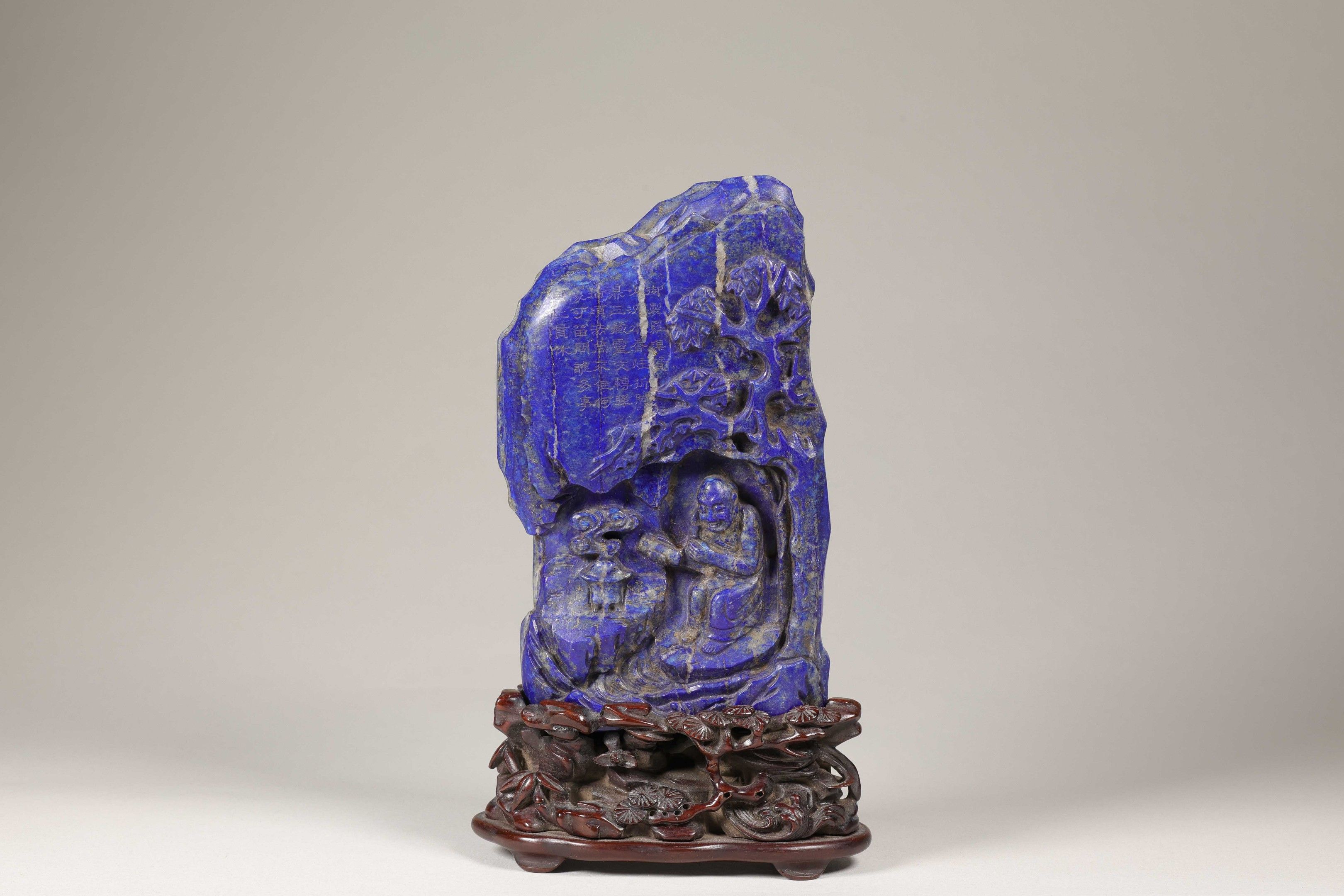 Lapis lazuli group in the form of a cave housing an arhat holding a scroll, next to a lingzhi vase on one side, the other side imitating a rock face. Comprising an incised poem in relief bearing an apocryphal signature of the monk "" (Guanxiu), from the series of sixteen poems dedicated to the sixteen arhats (Shíliù Luóhàn, ).