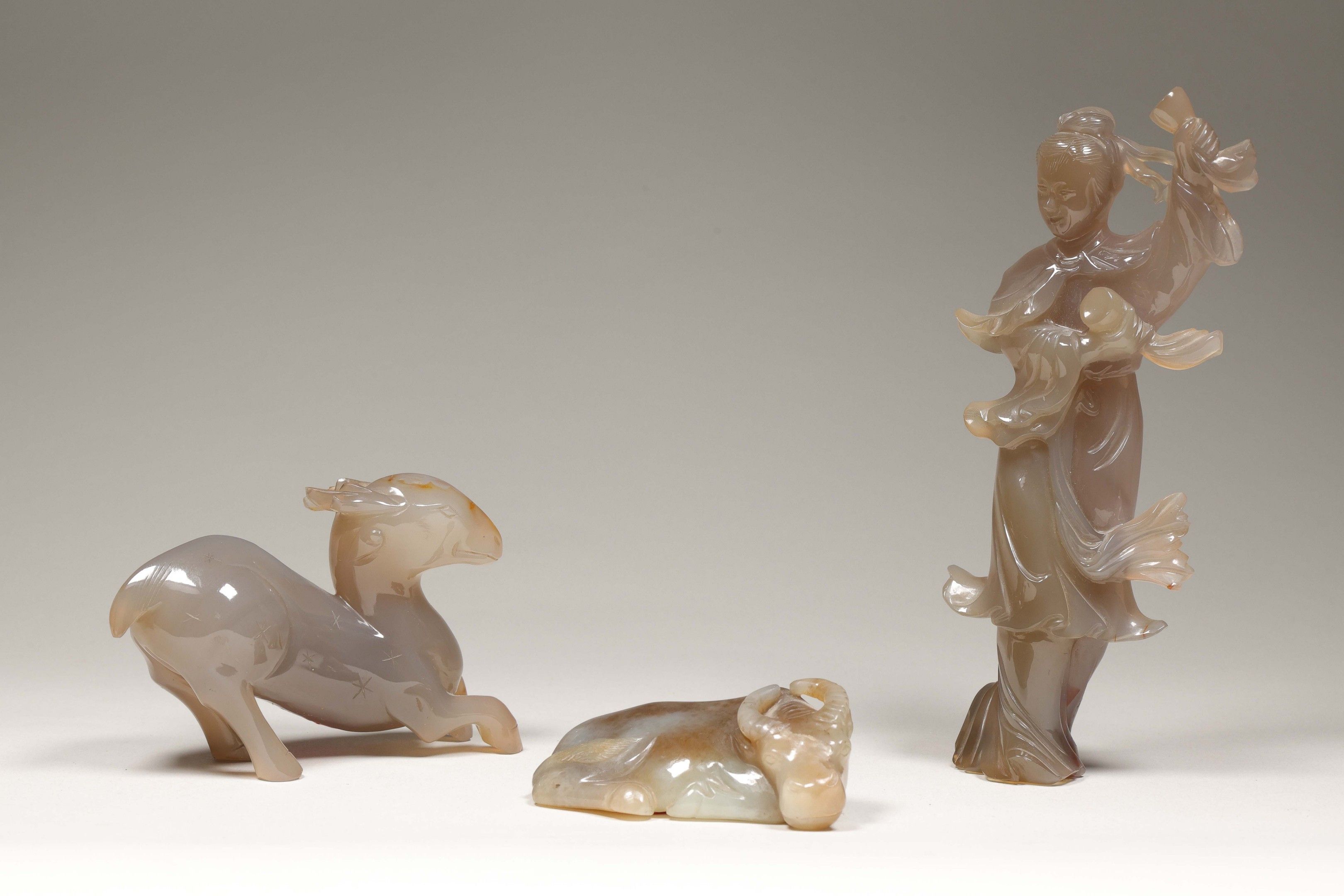 Set of three carved agate subjects, one in the form of a standing elegant woman, a deer and a reclining ox.