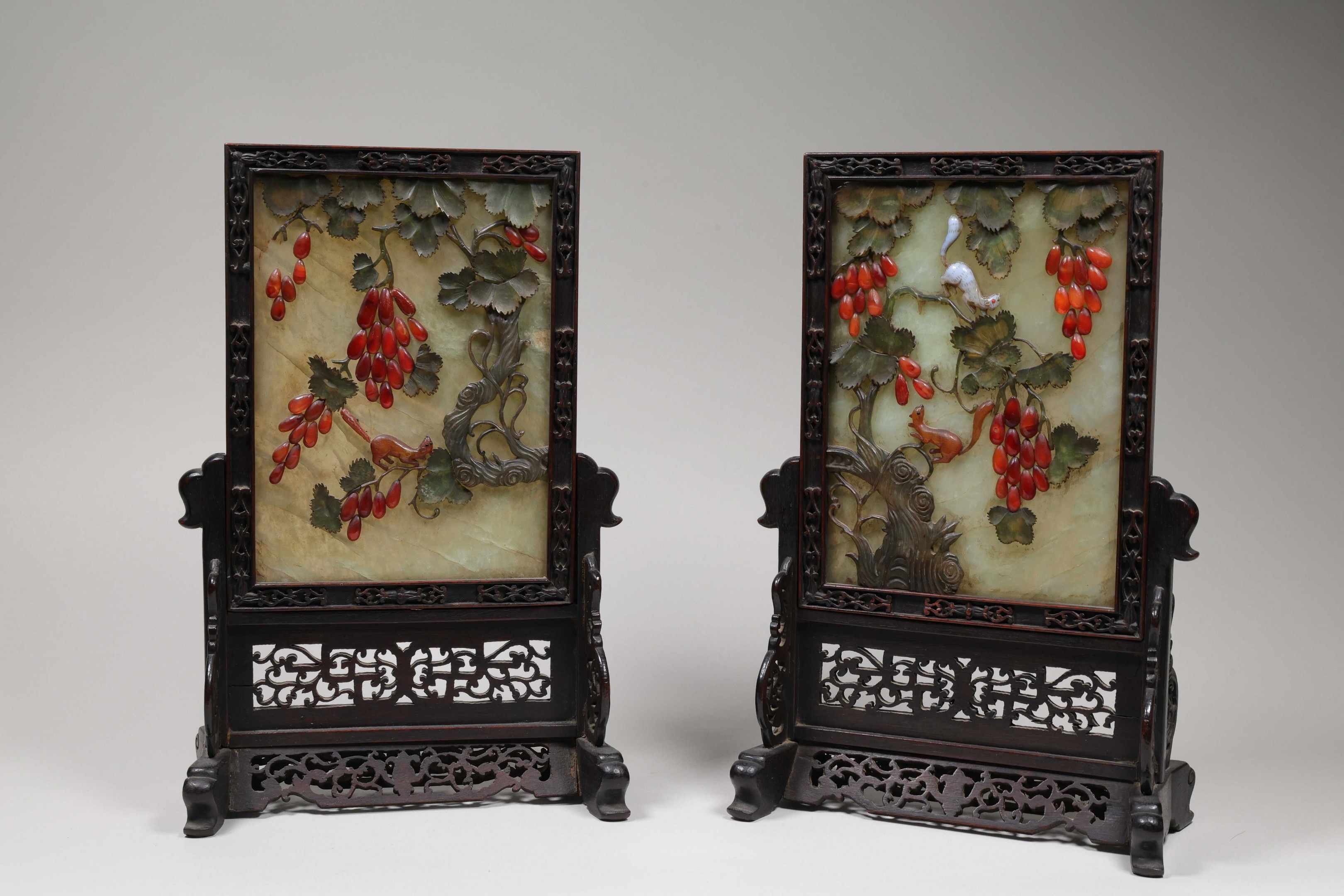 A pair of table screens, the central part of which consists of green hardstone plaques decorated in relief with carnelian, agate and hardstone inlays, depicting dormice moving among vine shoots. Carved and openwork wooden mounts.