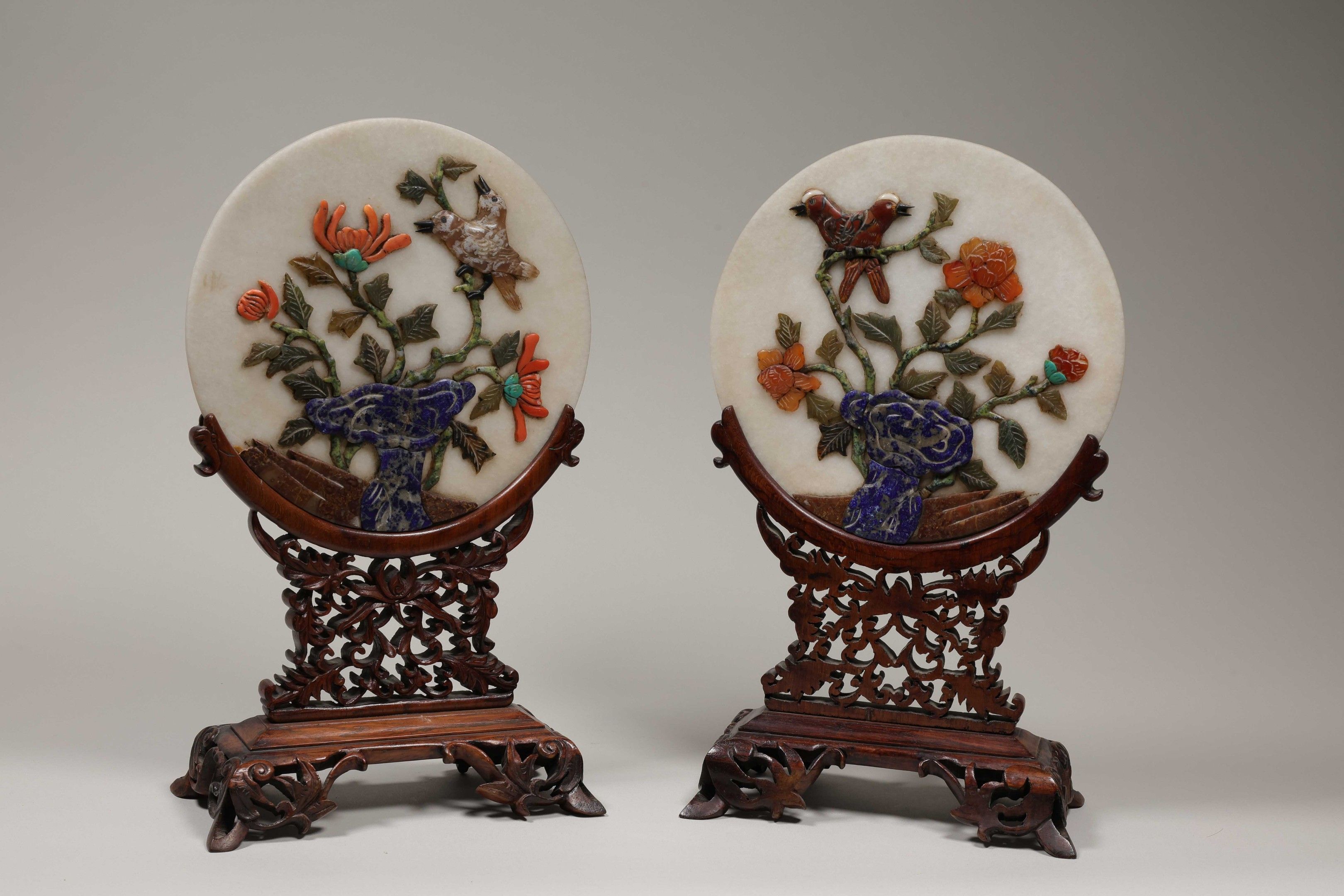 A pair of table screens, the central part consisting of alabaster plaques decorated with inlays of various hard stones including sodalite, carnelian, jasper, agate, coral and turquoise, depicting birds among flowering branches. The mounts are carved and openworked wood.