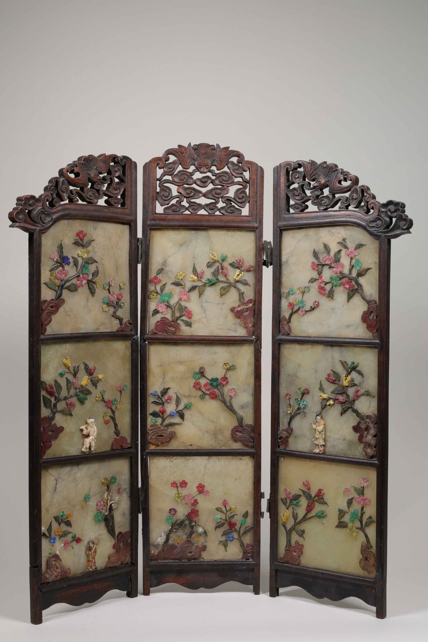 Small three-leaf folding screen, comprising hardstone plaques with glass inlay decoration of figures and flowering branches.