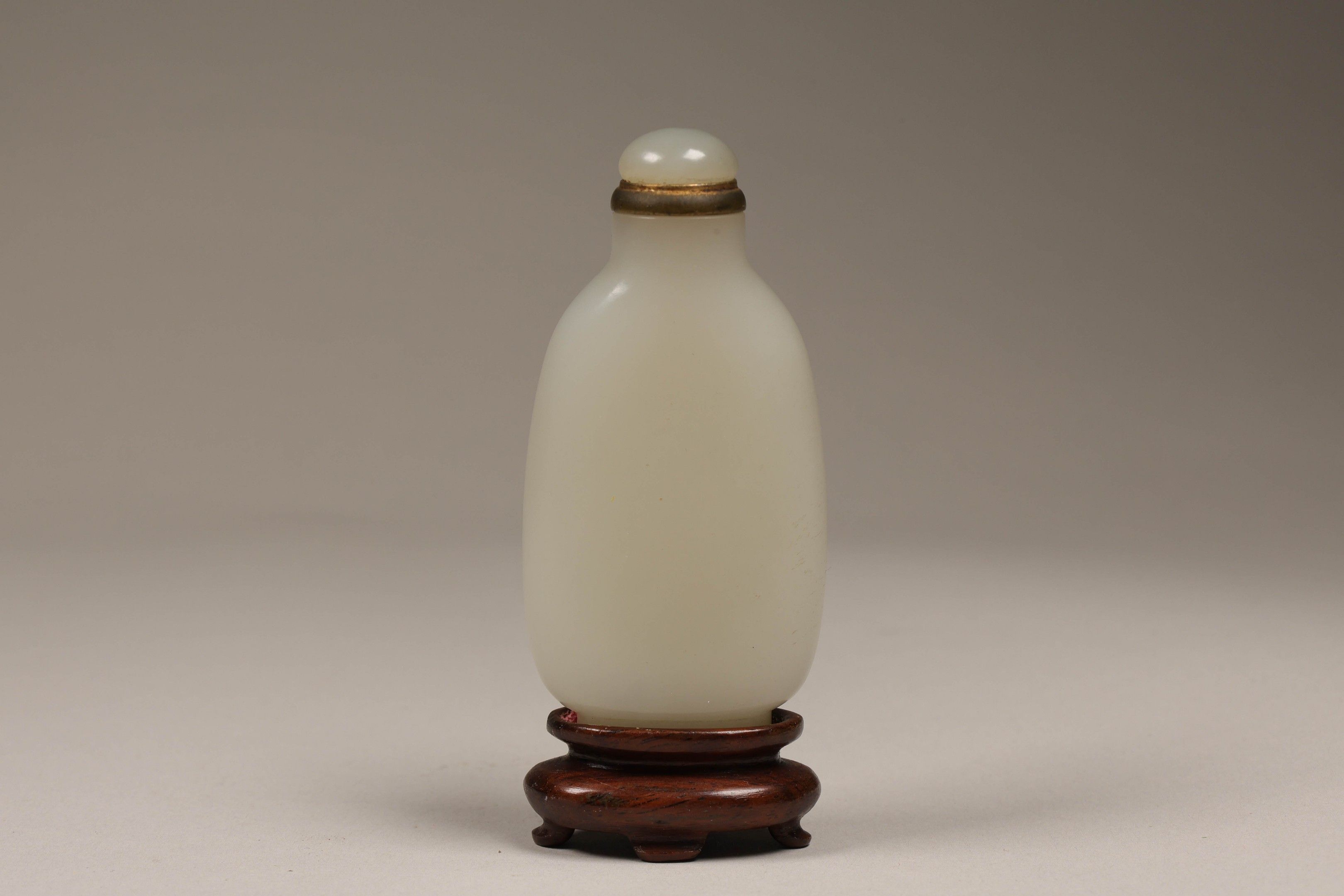 White jade snuffbox, baluster shape with flattened profile, with metal spoon and white jade cabochon stopper. With matching wooden base.