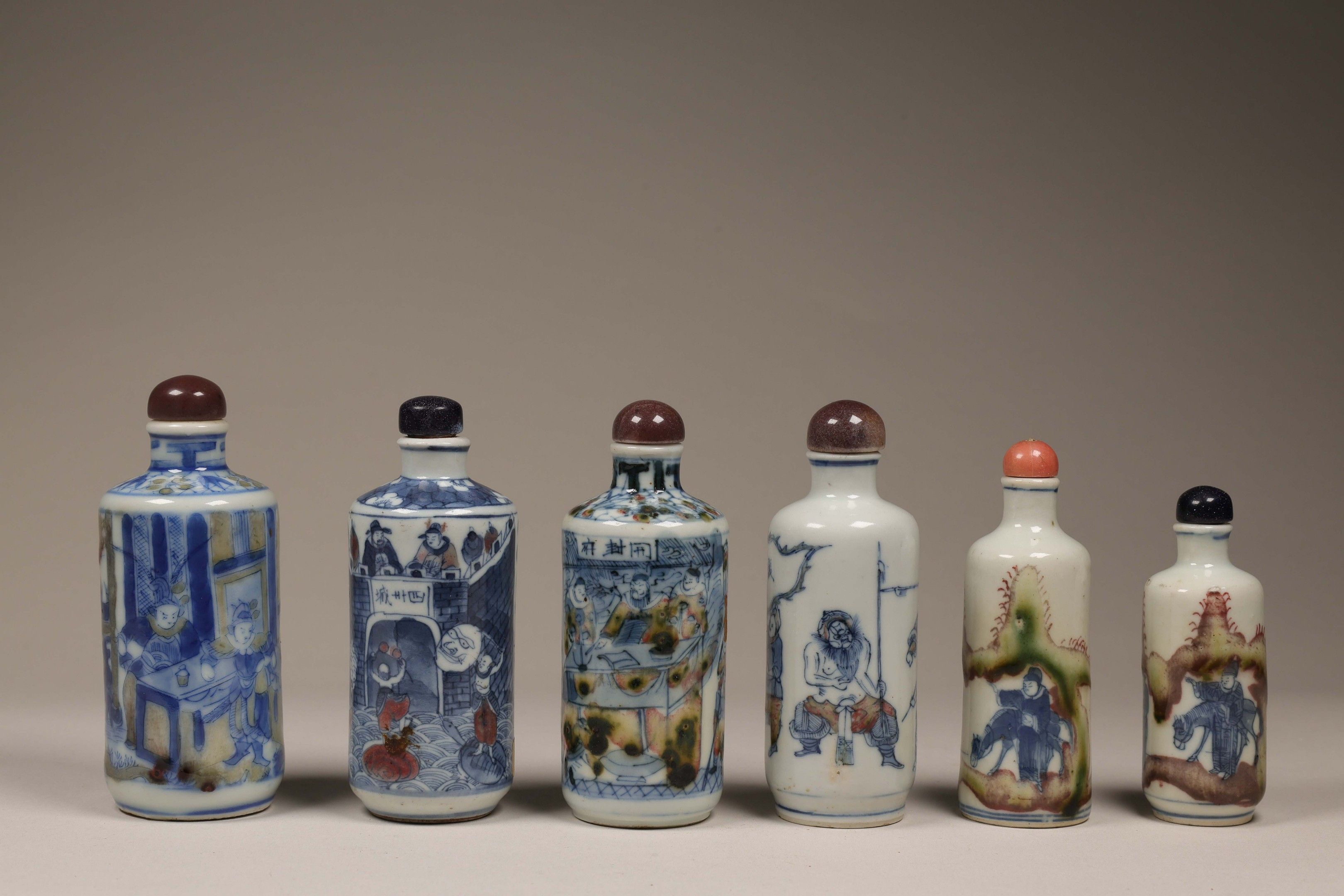Set of six cylindrical porcelain snuffboxes decorated in copper red and cobalt blue with animated scenes, four with Yongzheng six-character marks under the bases.