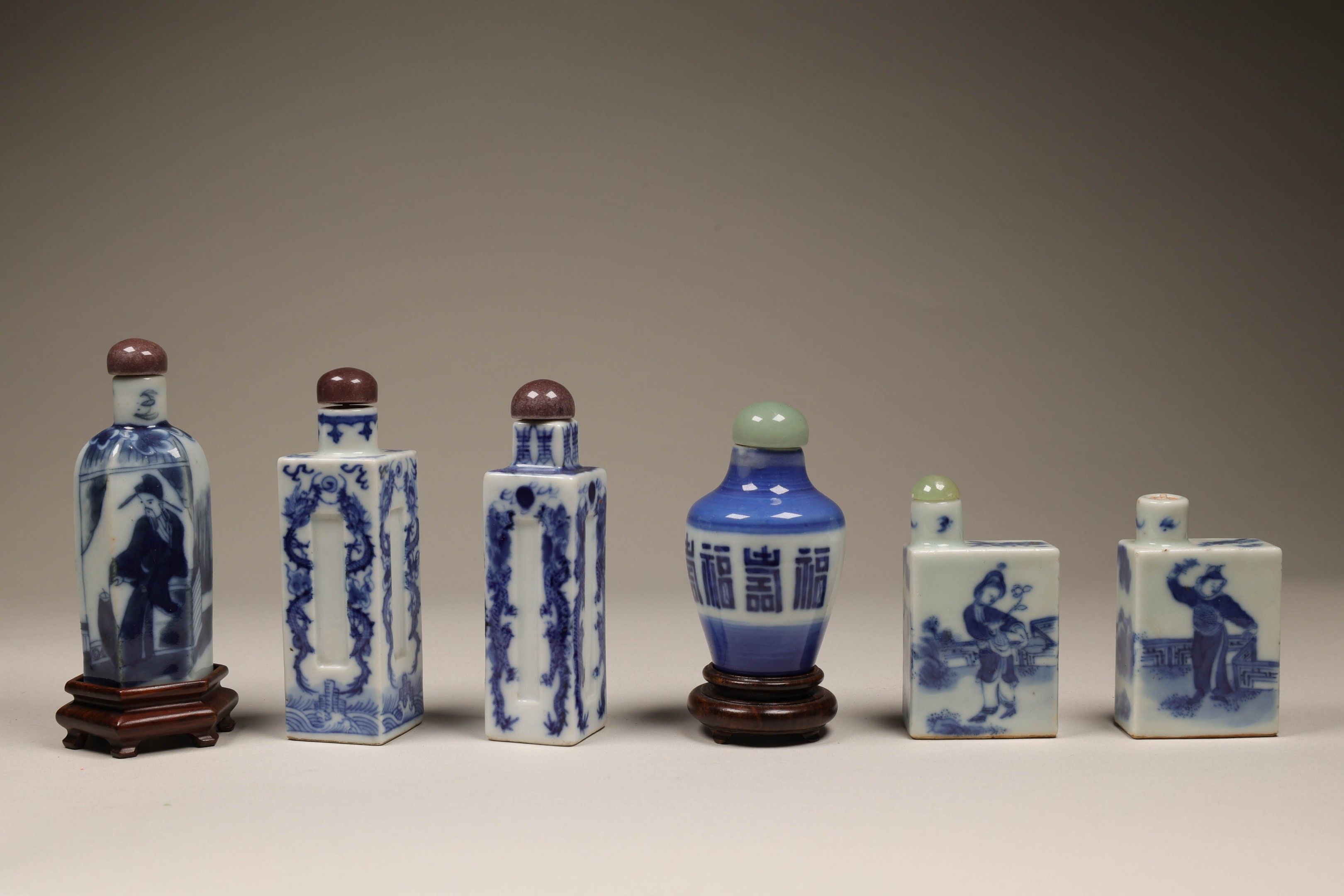 CHINA, Qing Dynasty Set of six blue and white porcelain snuf…