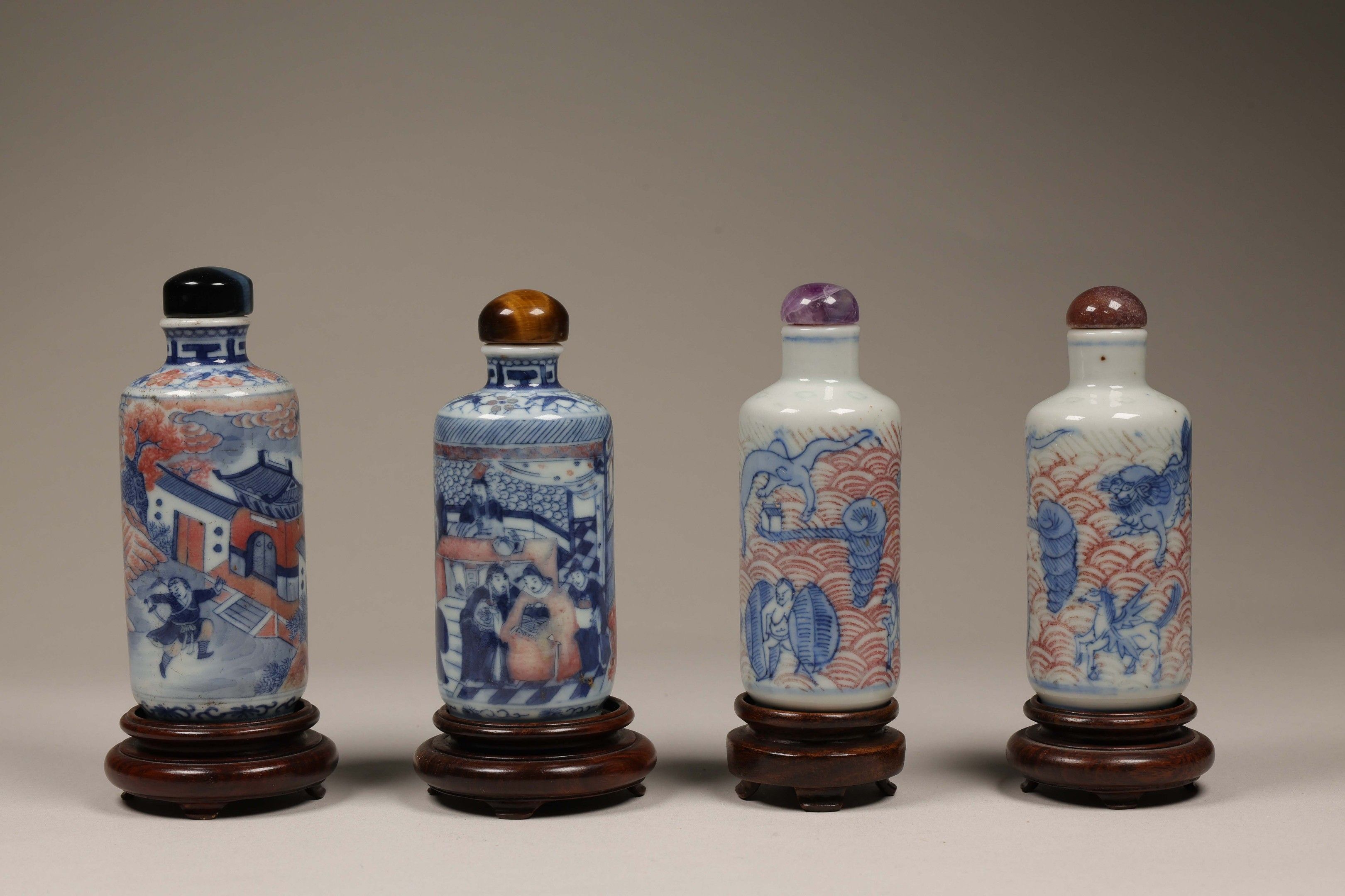 Set of five cylindrical porcelain snuffboxes decorated in copper red with animated scenes and mythological creatures.
