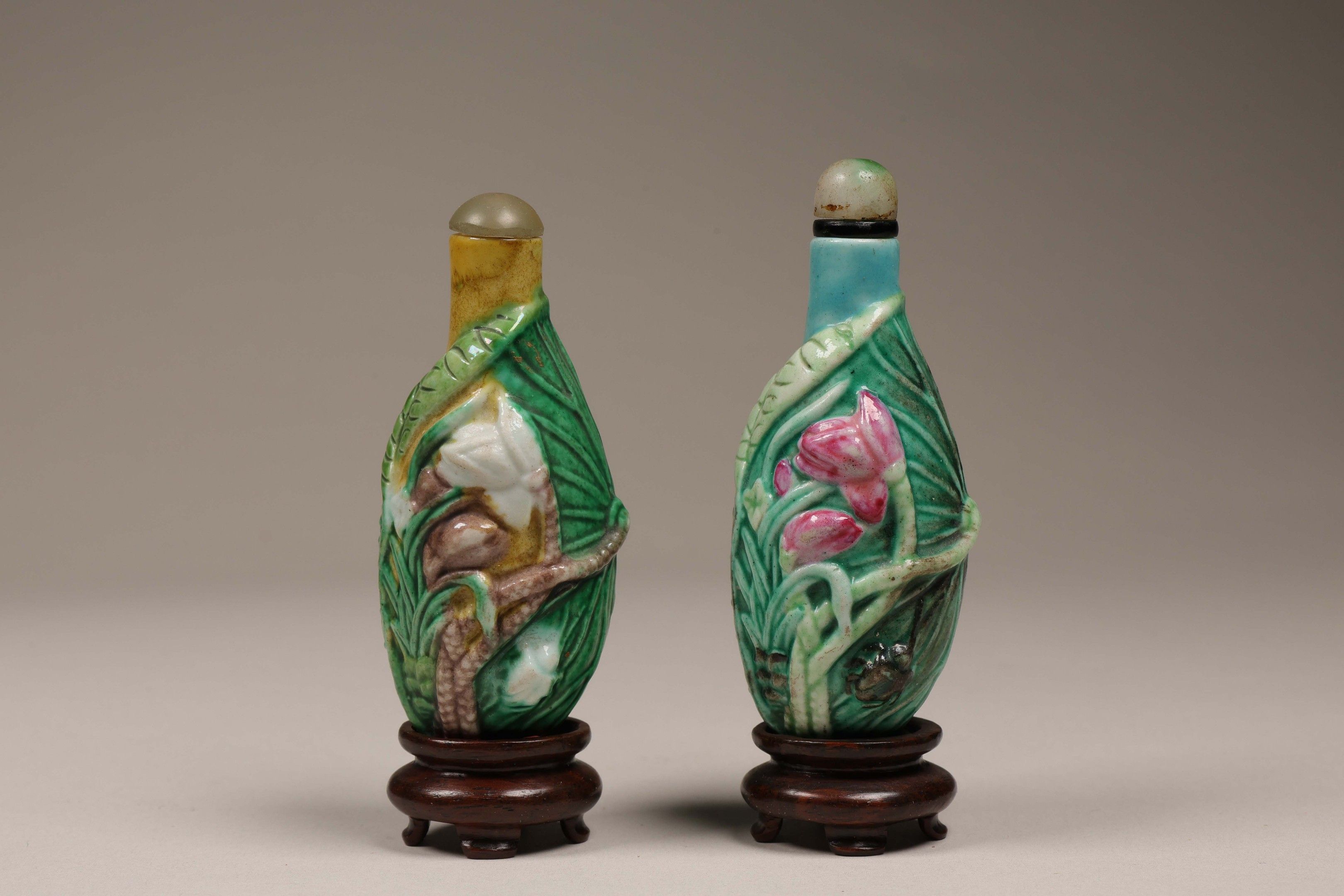 Set of two porcelain snuffboxes with relief-moulded decoration painted in polychrome enamels in the form of lotus flowers with their leaves and insects. One with a wooden base.