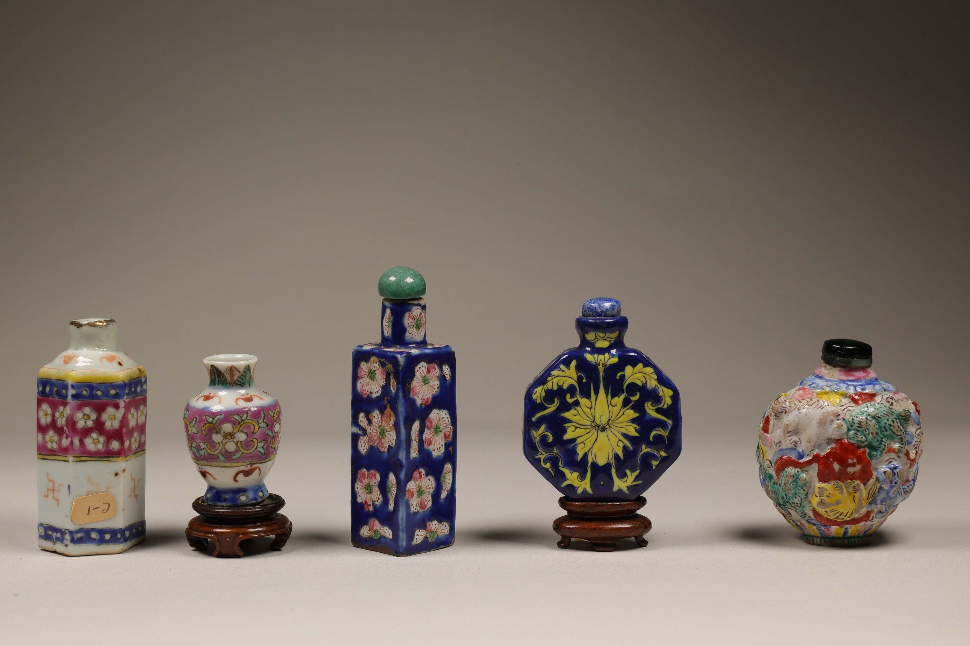 Set of four snuffboxes and a miniature vase in polychrome enamelled porcelain, of quadrangular, hexagonal, baluster and circular shape. One with moulded decoration in relief of chimeras bearing an apocryphal Qianlong mark. With added stoppers.