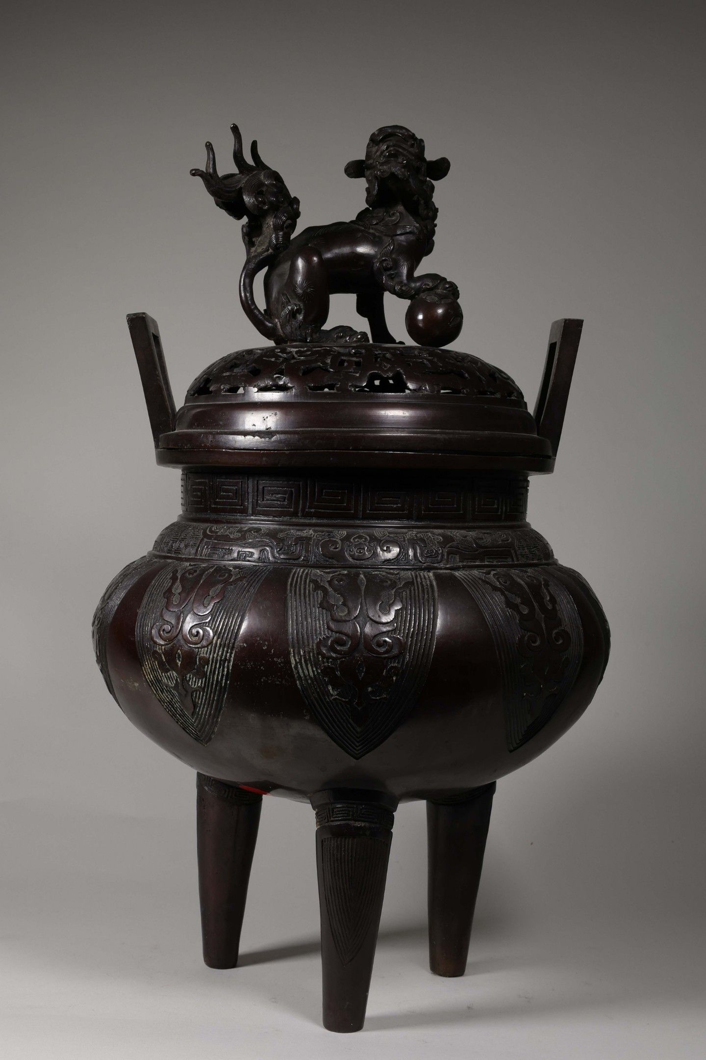 A large bronze incense burner with a brown patina standing on three straight legs, the circular body decorated with banana leaves in the archaic style, the lid adorned with a chimera and its brocade ball.