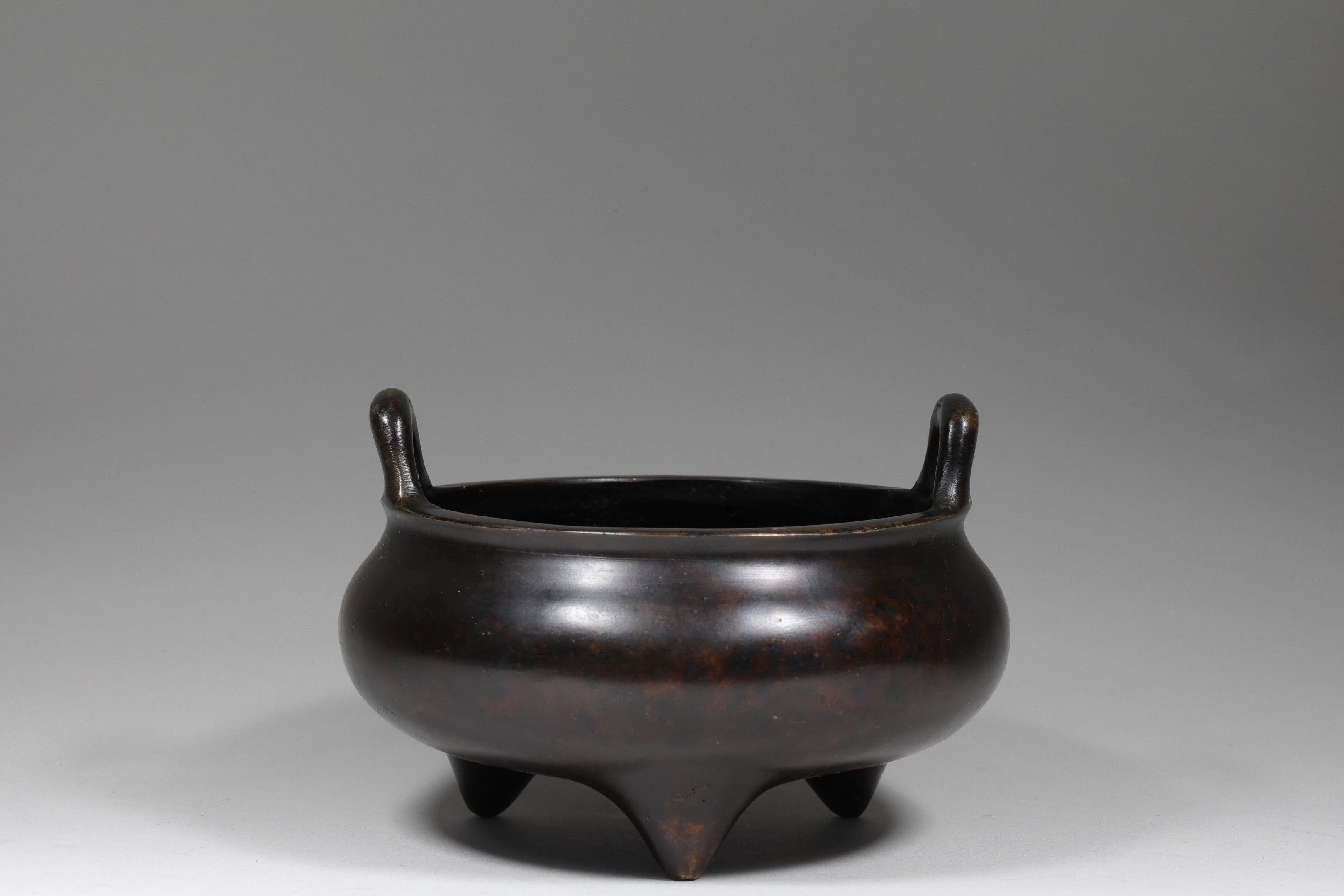 Circular, brown patina bronze incense burner standing on three small feet. A mark "" (Dà Qng Liú Shí'n jin) reading "Under the supervision of Liu Shian, Qing dynasty" stamped under the base.