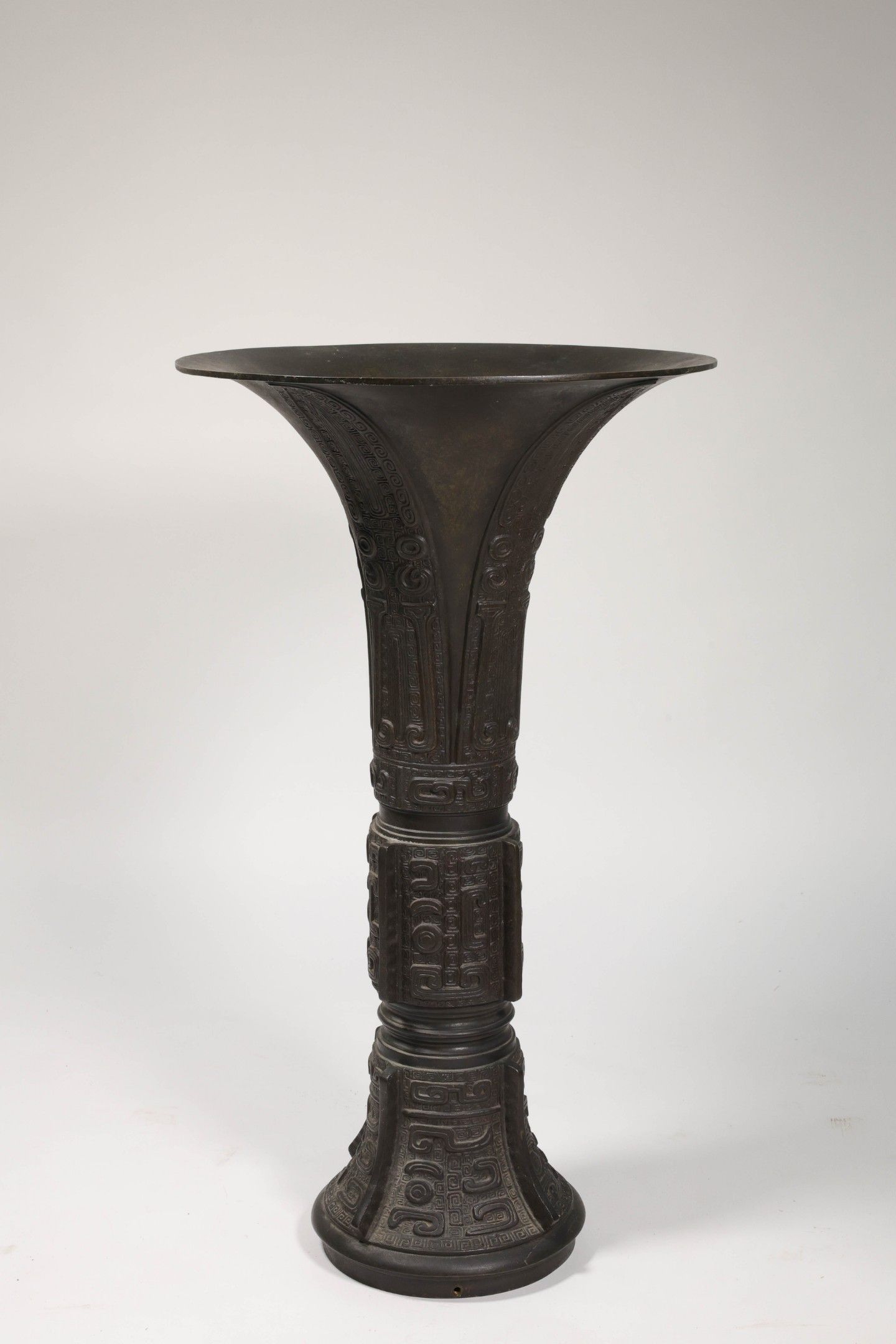 Large bronze vase in the archaic style, in the form of the "Gu" models. Formerly mounted as a lamp.