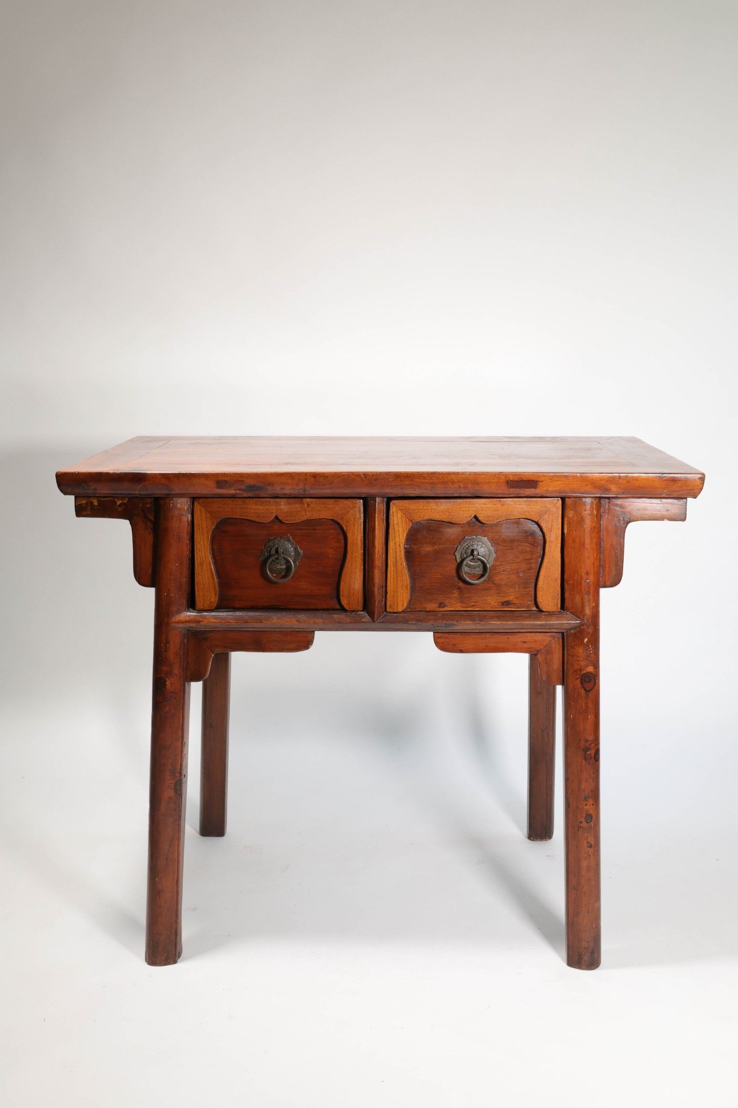 Wooden side table, opening with two drawers on the waist, the quadrangular top, the whole resting on four straight legs, joined by two straight lateral struts.