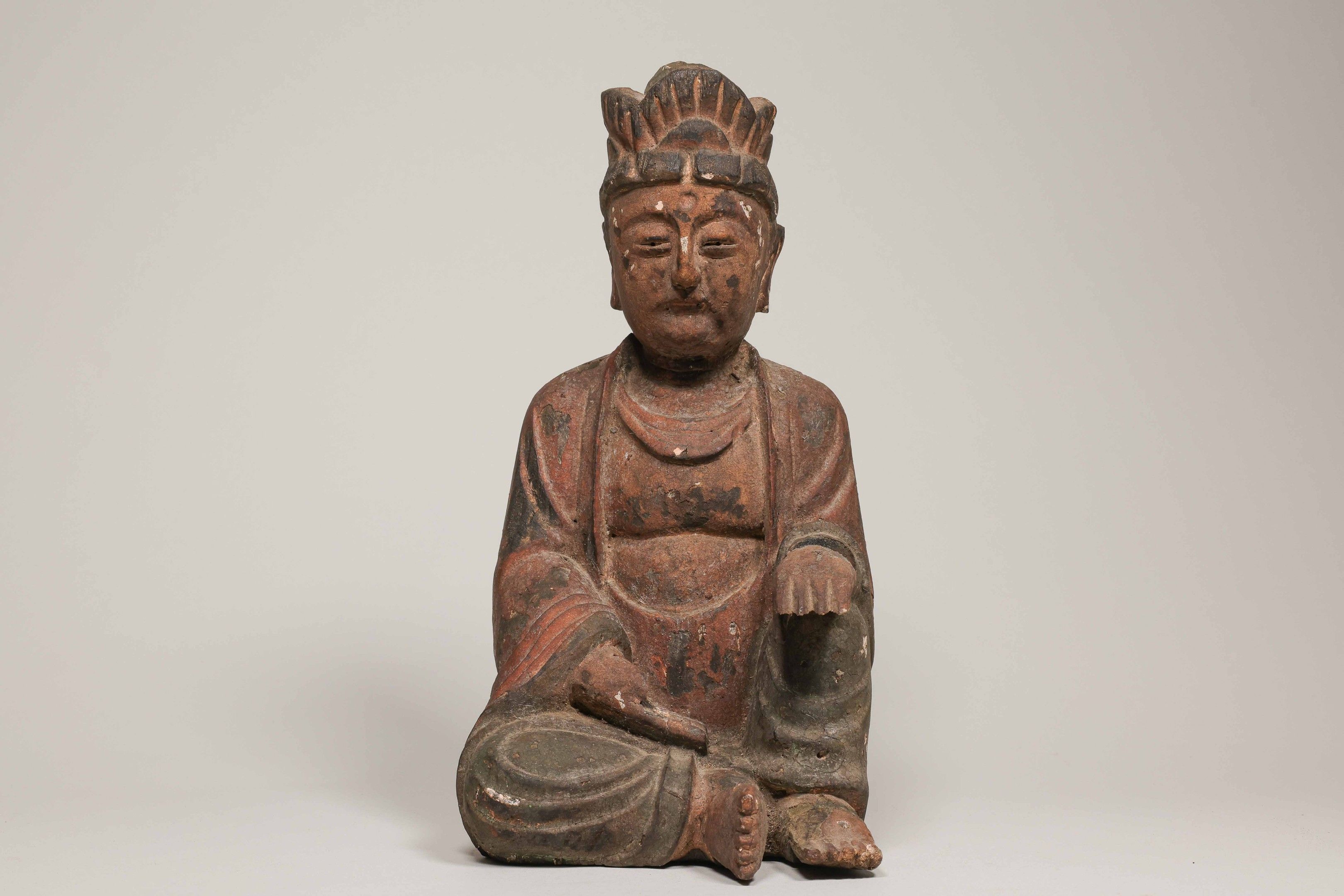 Wooden sculpture representing a seated Bodhisattva in a relaxed posture, one leg bent and the other resting on the ground. The right hand is resting on the knee, while the left is resting close to the foot in a meditative gesture. Old traces of polychromy.