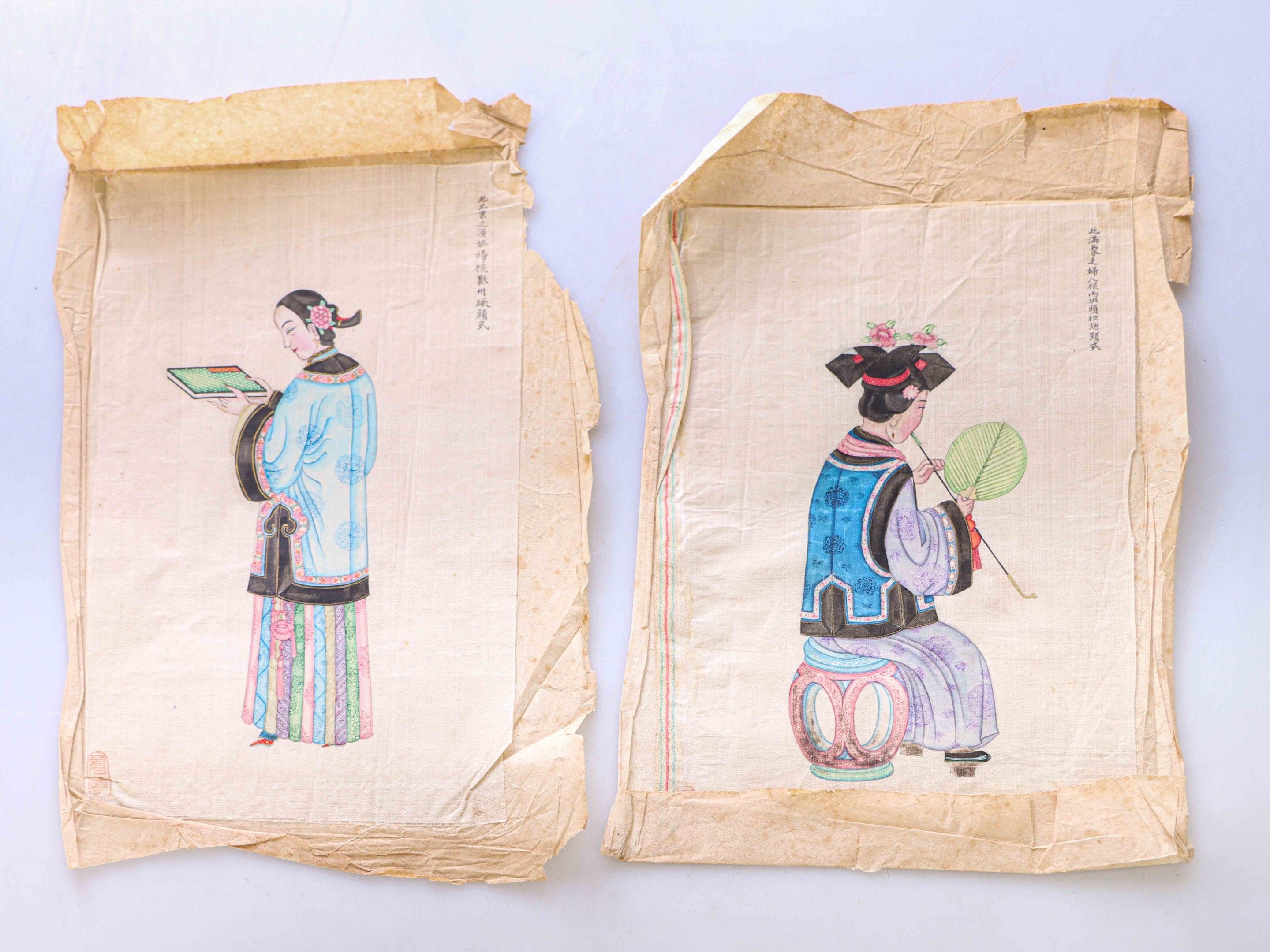 Two ink and colour paintings on silk depicting elegant ladies, one standing with an album, the other with her back to a stool smoking opium. Inscribed top right.