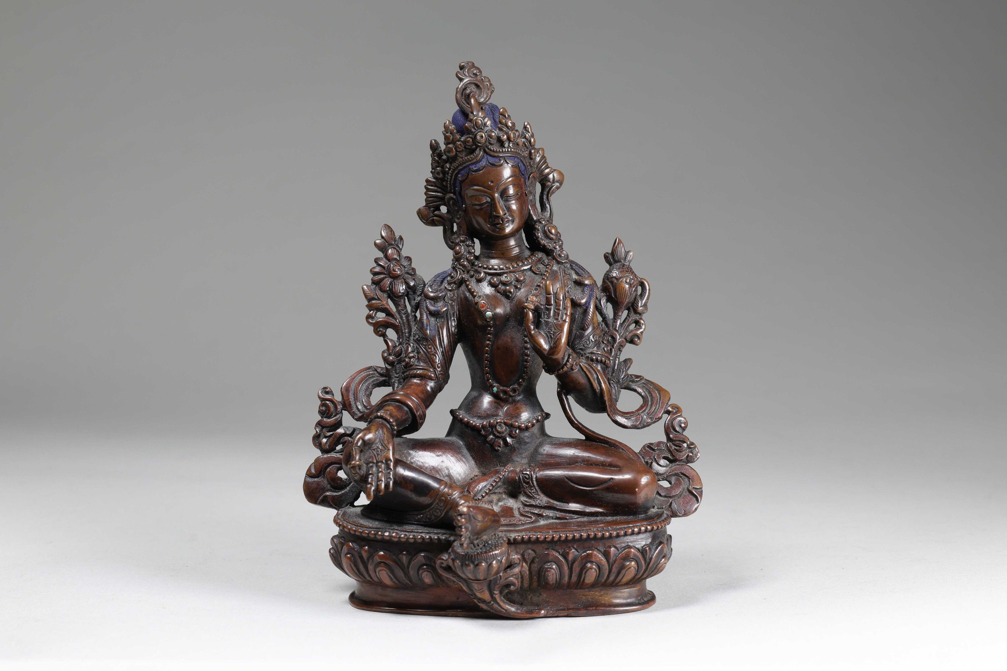 Statuette of Tara in patinated bronze. She is depicted seated in "Lalita Asana" on a lotiform base, holding climbing lotuses in each of her hands. She is adorned with jewels and wearing a petal tiara.