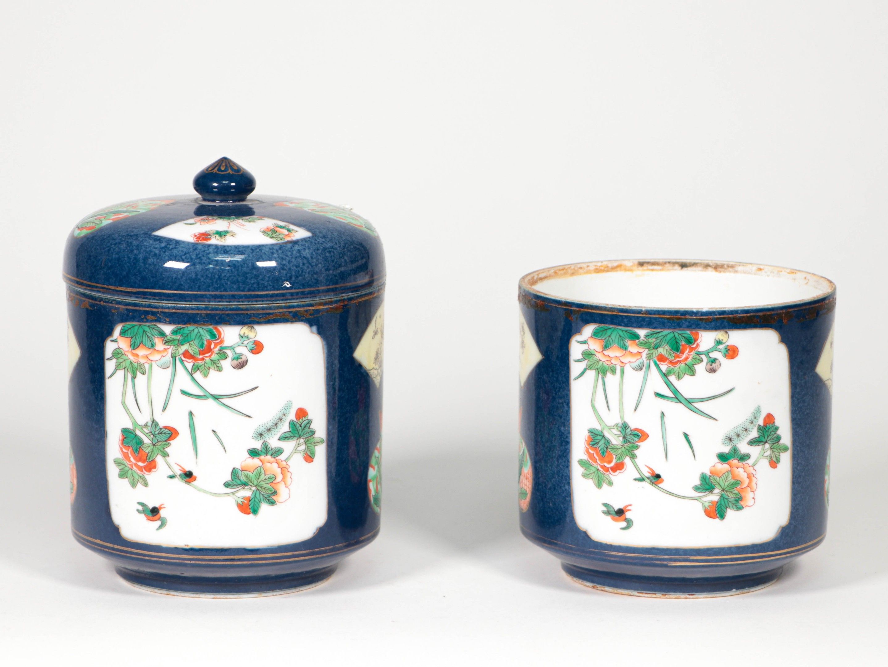 Pair of covered pots in powder blue enamelled porcelain decorated in leaf-shaped reserves with flowers and insects in green family enamels. Samson mark and diamond mark under the base.