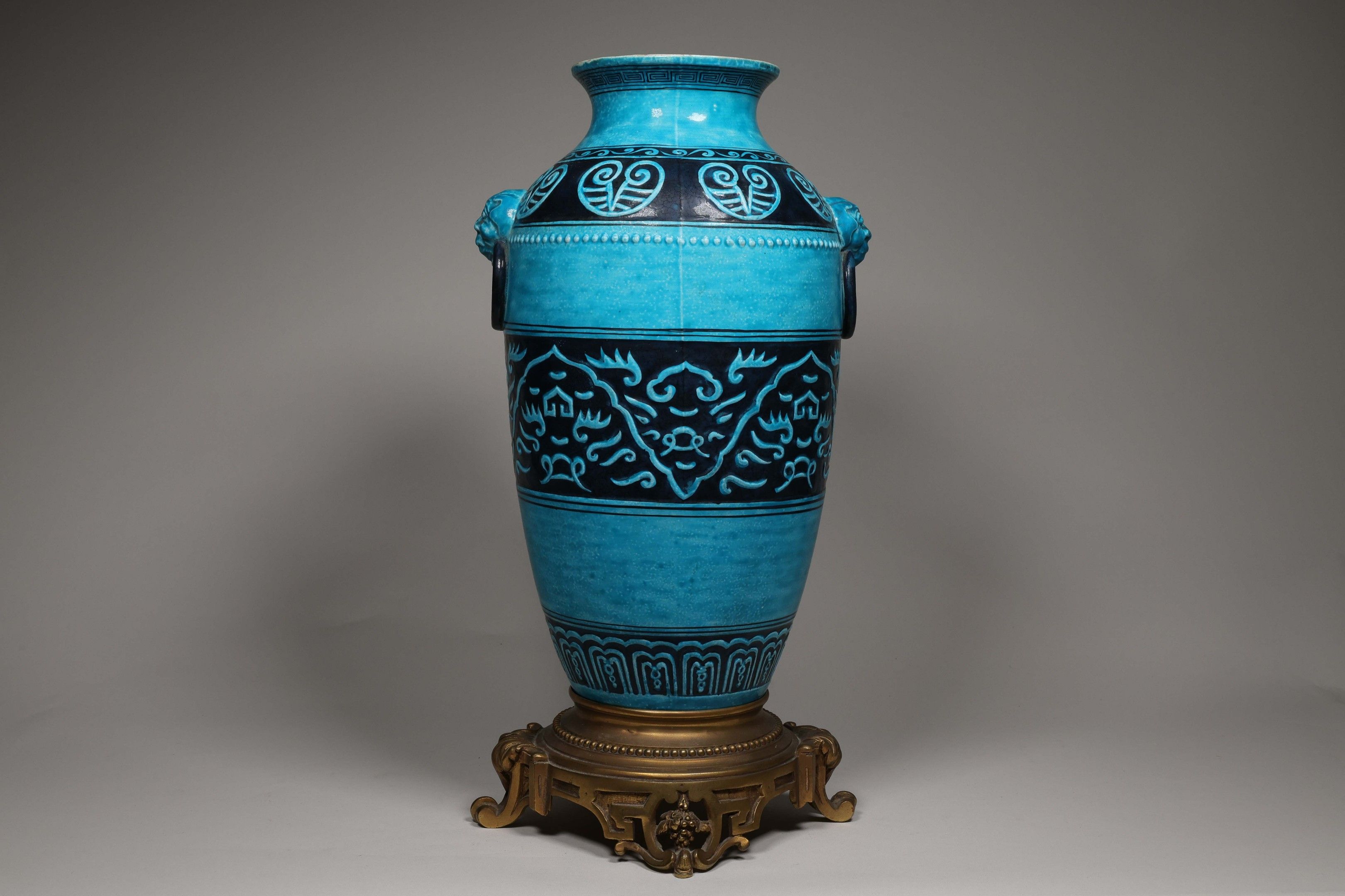 Porcelain baluster vase with ovoid body decorated with friezes of archaic decoration in relief, flanked by two handles in the form of chimera masks with rings, the whole with a turquoise and dark blue glaze. A European mounting is included.