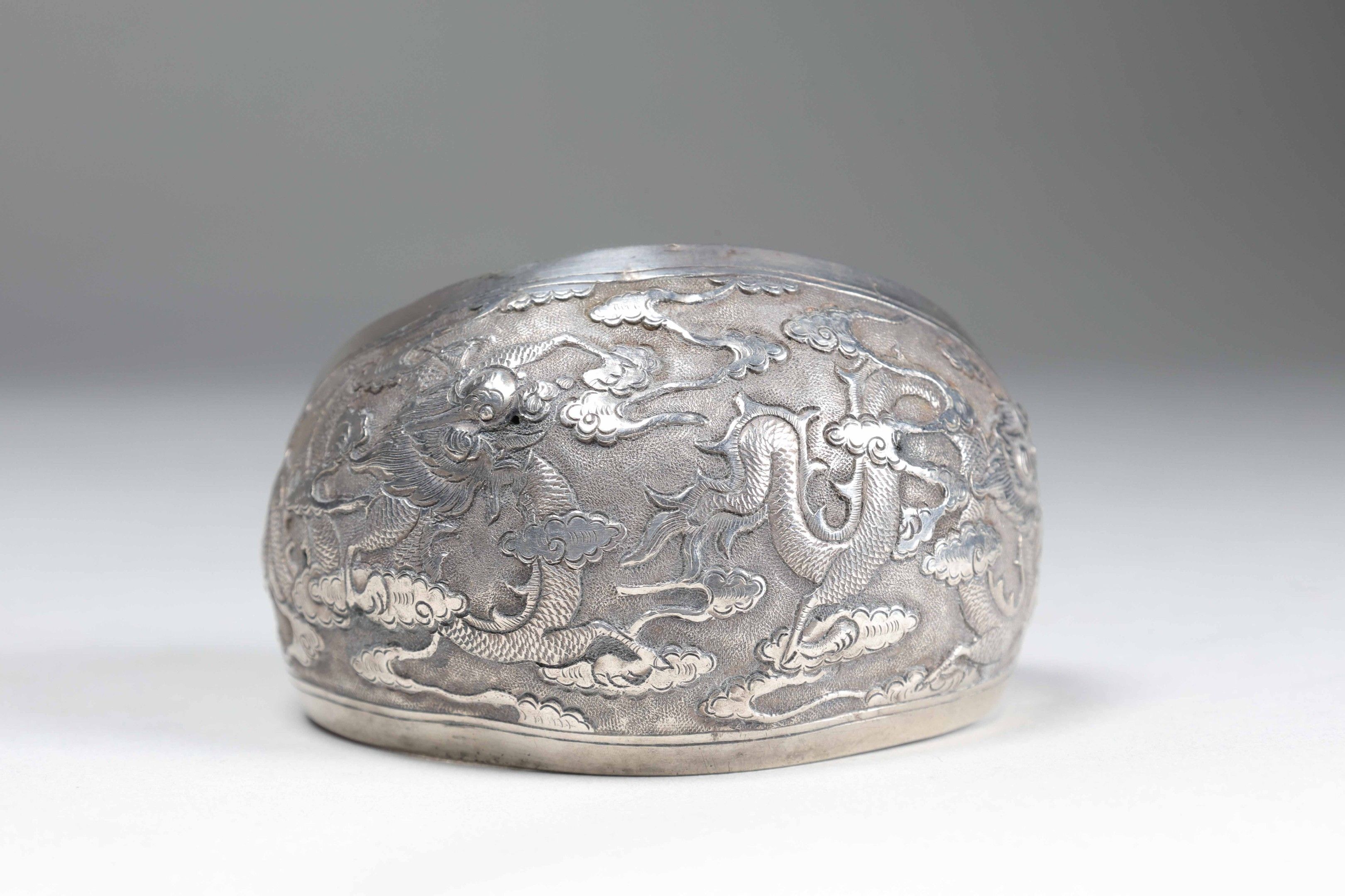 Presumed low-title silver bracelet with chased and repoussé decoration on the outside depicting a dragon moving among clouds.