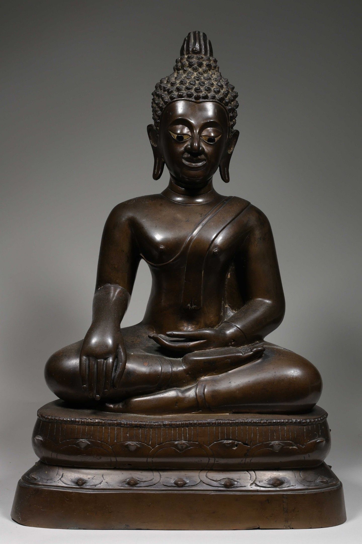Sculpture in bronze with brown patina representing the Buddha seated in padmasana, his hands placed in the gesture of taking the earth as witness.