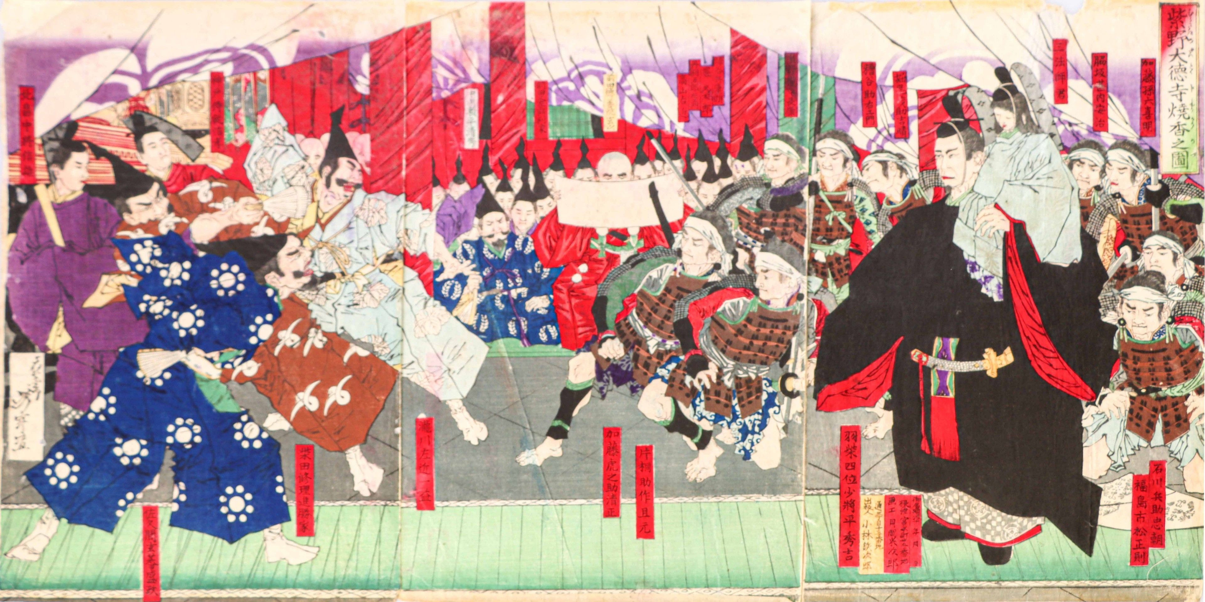 Triptych depicting a matsuri scene at the Daitokuji shino, based on the story of Toyotomi Hideyoshi.