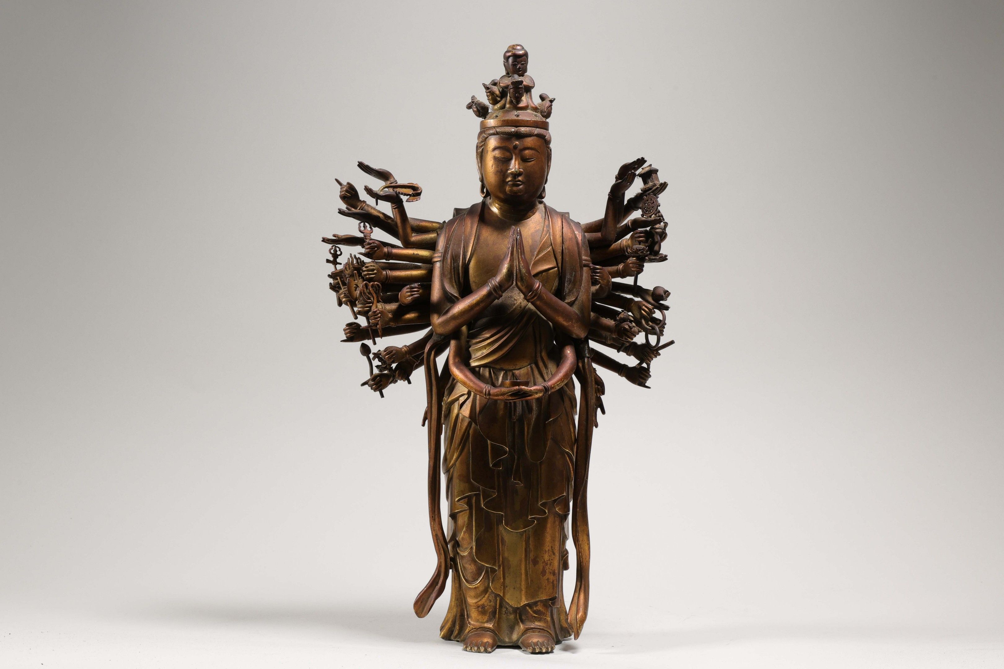 Large bronze statuette with golden patina representing the goddess Kannon with a thousand arms (Senju Kannon). The deity stands with her main hands clasped in prayer (anjali mudra), her secondary arms fanned out around her body, holding various Buddhist attributes: lotus, vajra, Dharma wheel, trident, bell and pearl. The face is meditative, the eyes half-closed, the mouth making a slight pout. Straight hair swept back, topped with a diadem adorned with an effigy of Amithaba Buddha (Amida Nyorai). The dress has supple folds that go down to the bare feet.