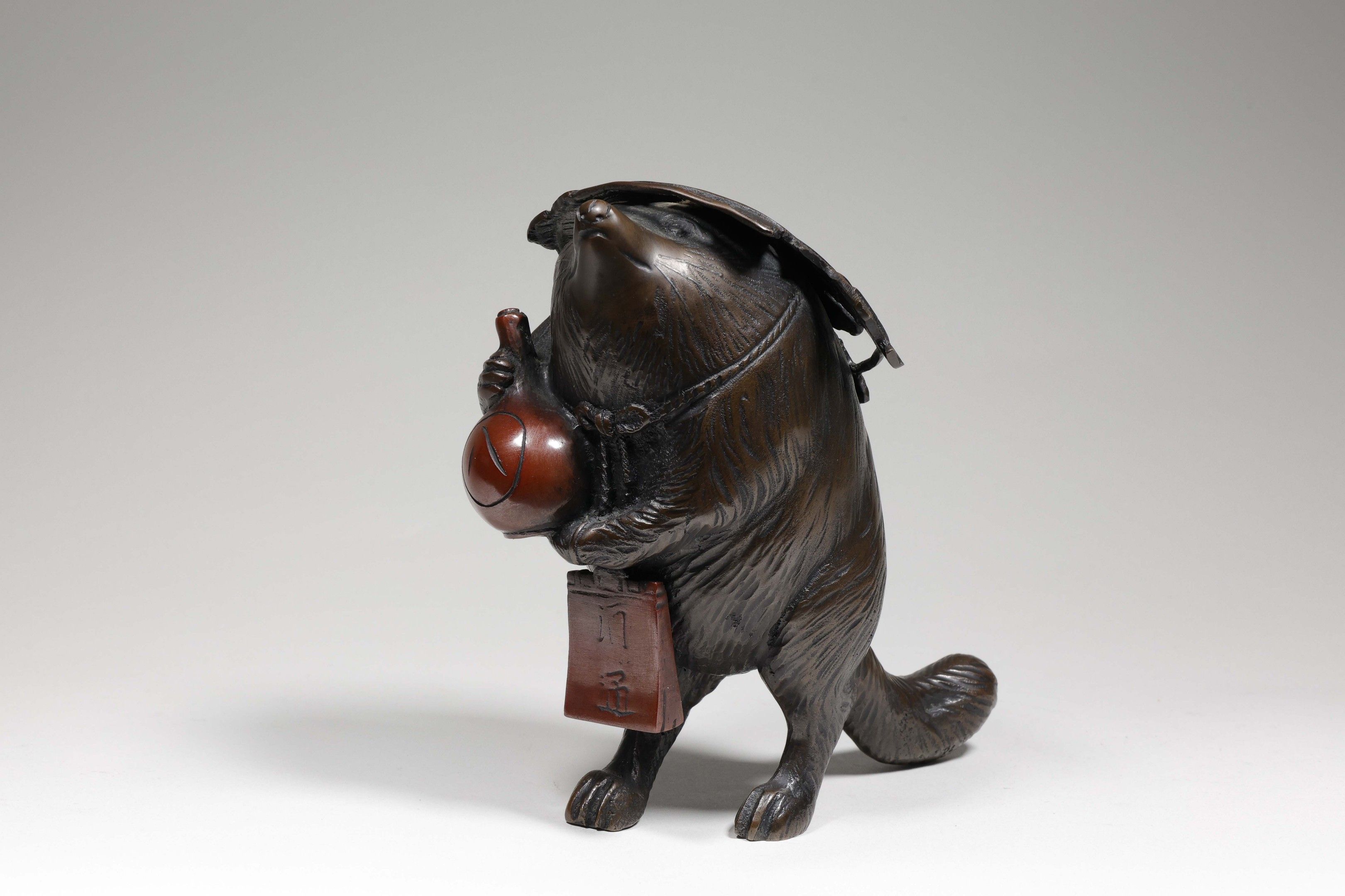 Brown patina bronze Okimono representing a Tanuki standing as a travelling merchant, holding his sake gourd and panel, his head covered with a worn peasant hat. Signed "Chikusen" () on the back.