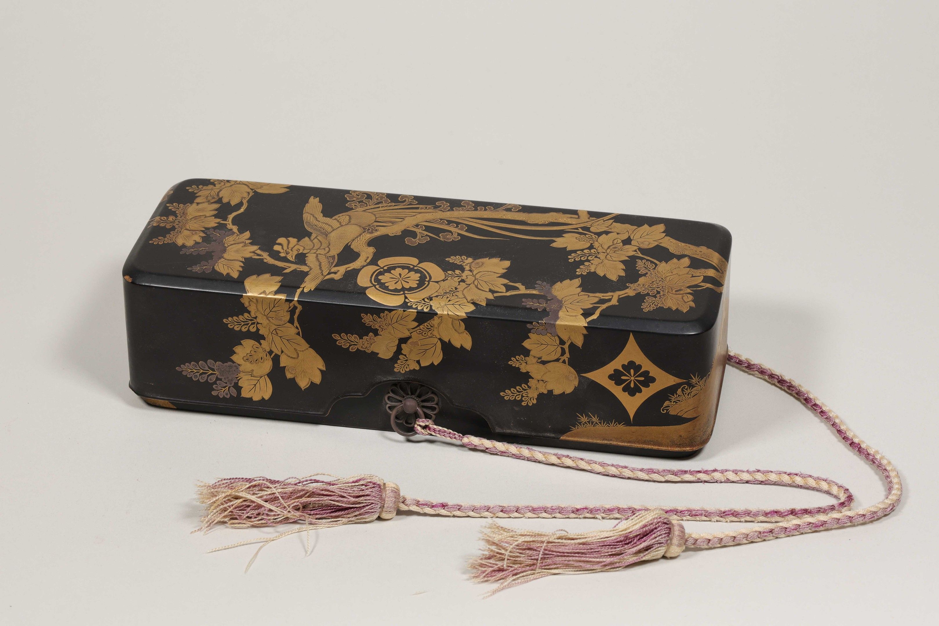 A small quadrangular lacquered wood document box, decorated in gold and silver hira maki-e lacquer on a black background with a phoenix among paulownia branches. The interior is in nashiji lacquer. With metal clasp in the shape of chrysanthemums, with cord.
