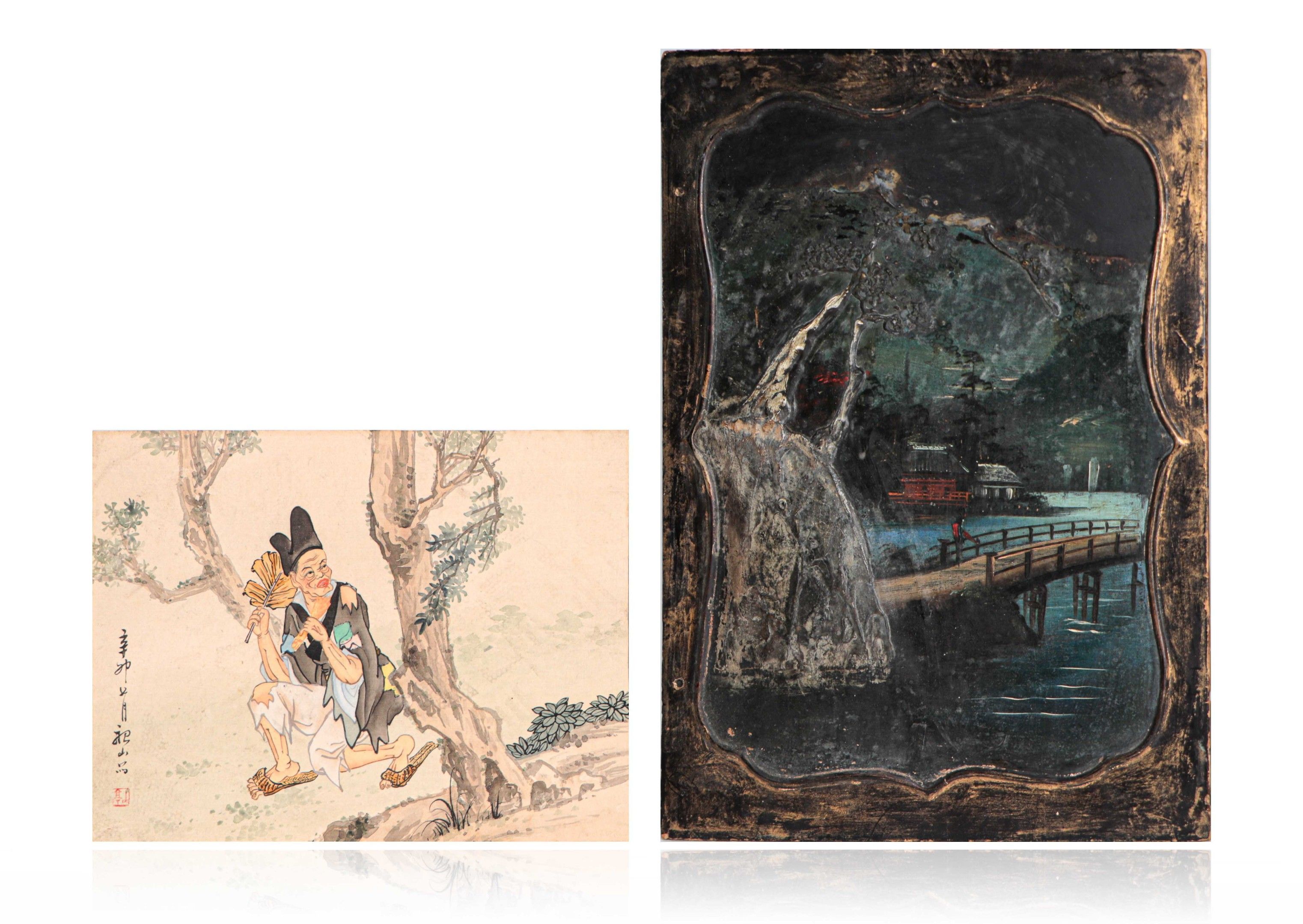 Set of two pieces comprising an ink and colour painting on silk depicting a pilgrim in a landscape