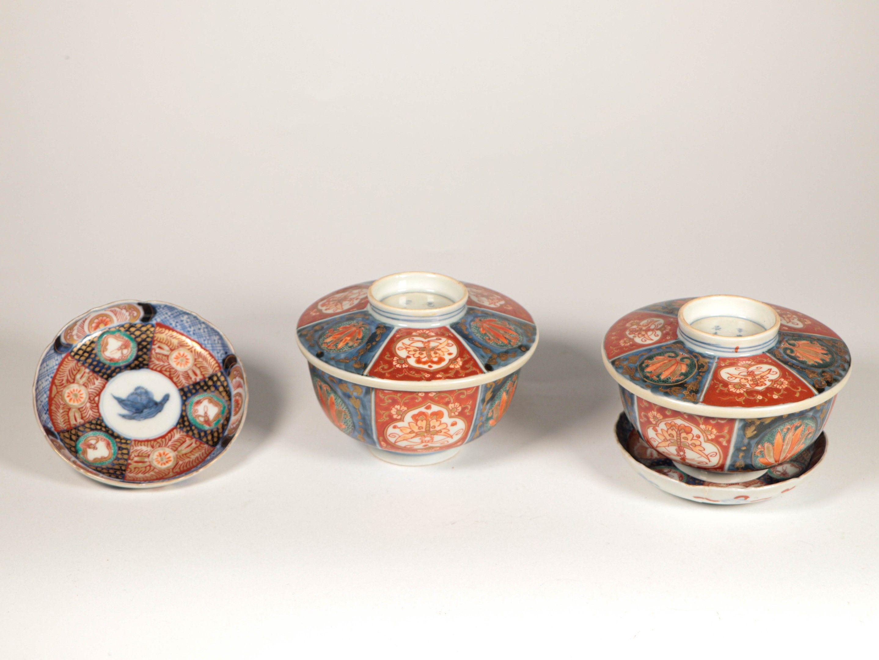 Set of four porcelain pieces with Imari decoration including two covered tea bowls and two dishes. Marks "Fuki-Chosun" ( ) under the bases.