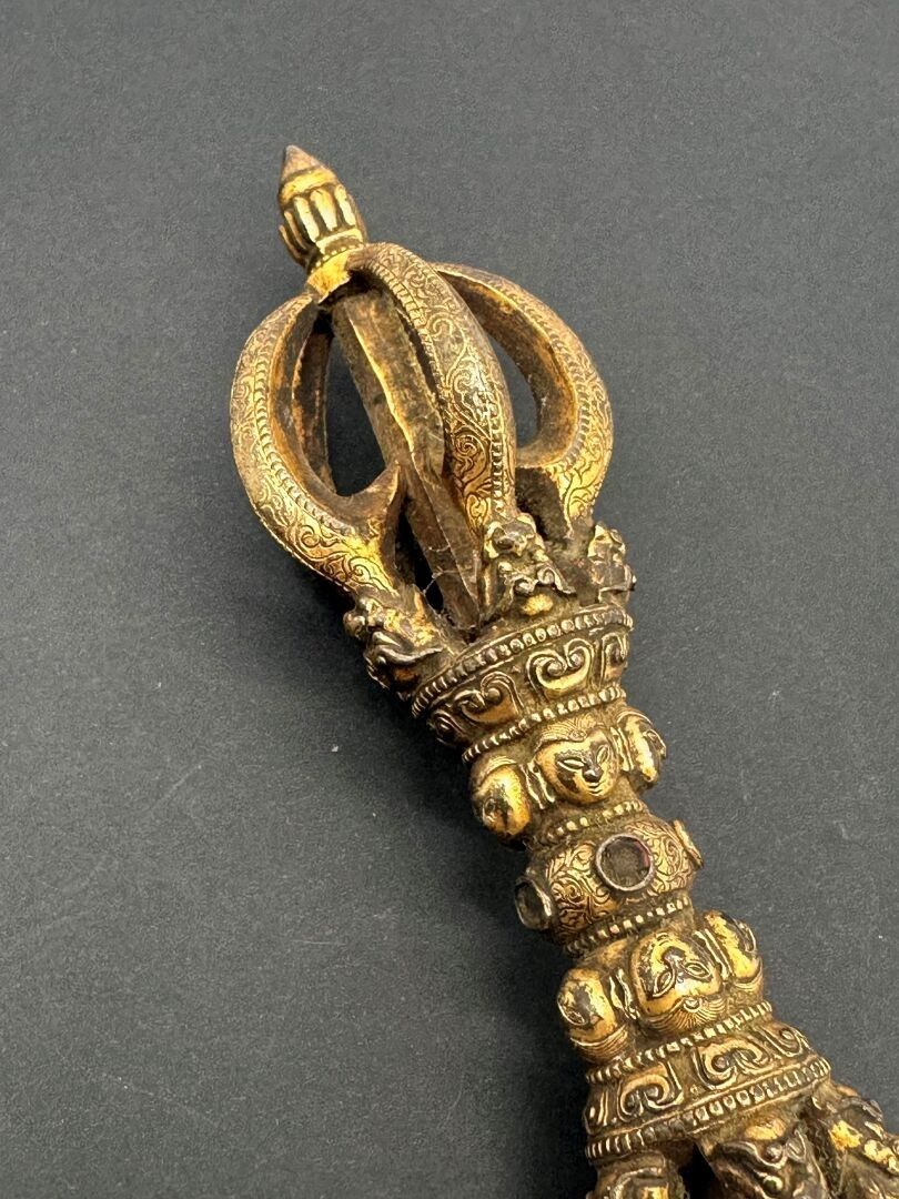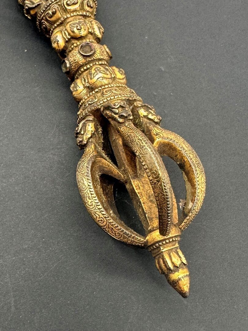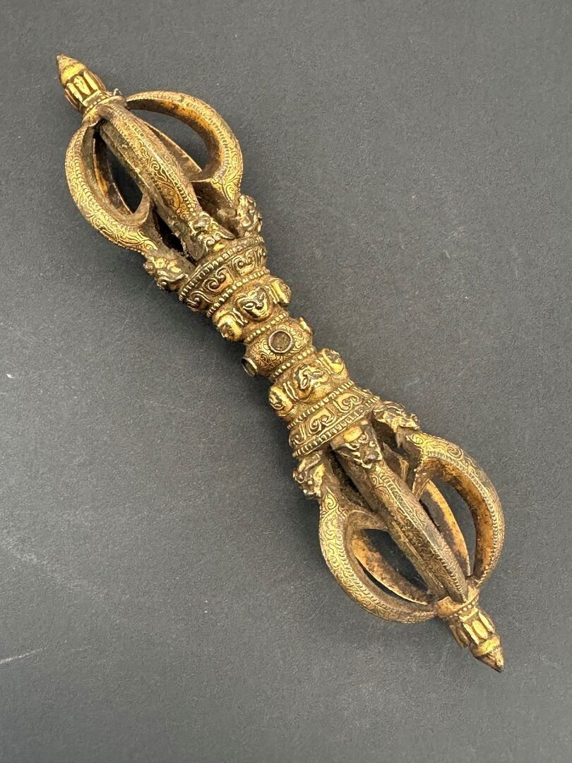 Gilt bronze vajra, the branches spat out by Makara heads, the central part decorated with masks and stylised lotus panels.