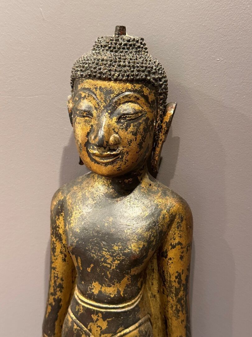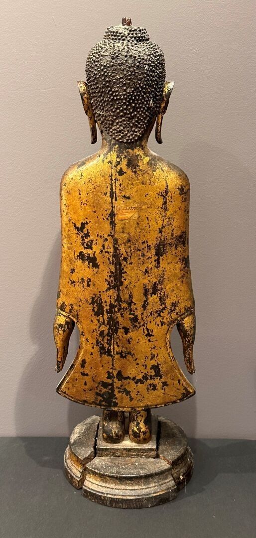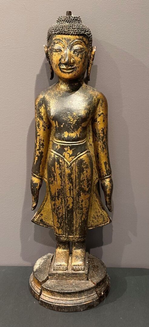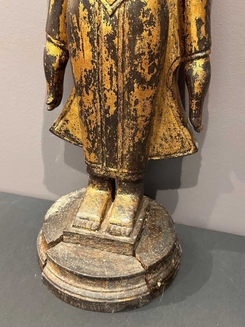 Antique lacquered and gilded wooden statue of a standing Buddha with his hands along his robe.