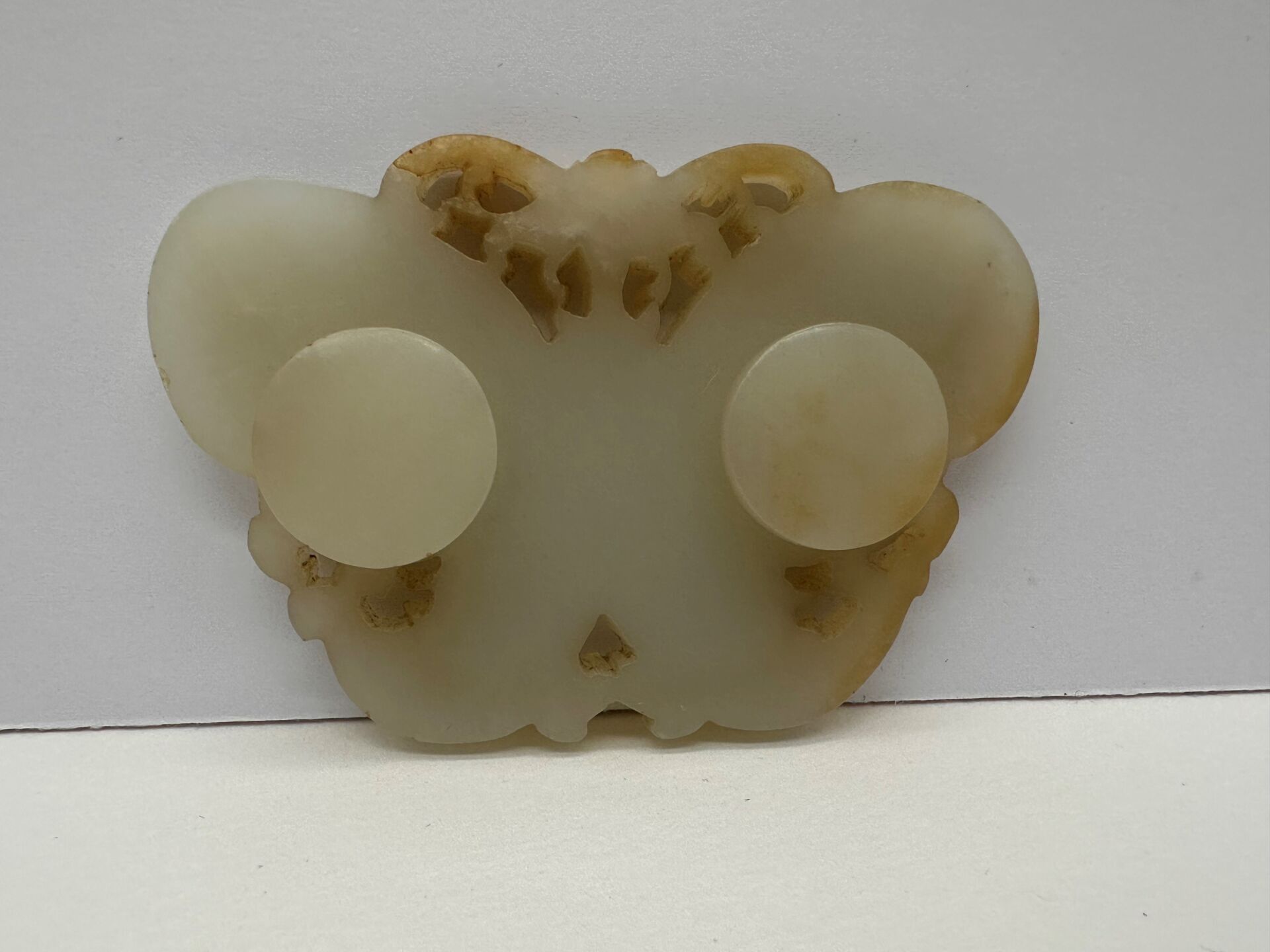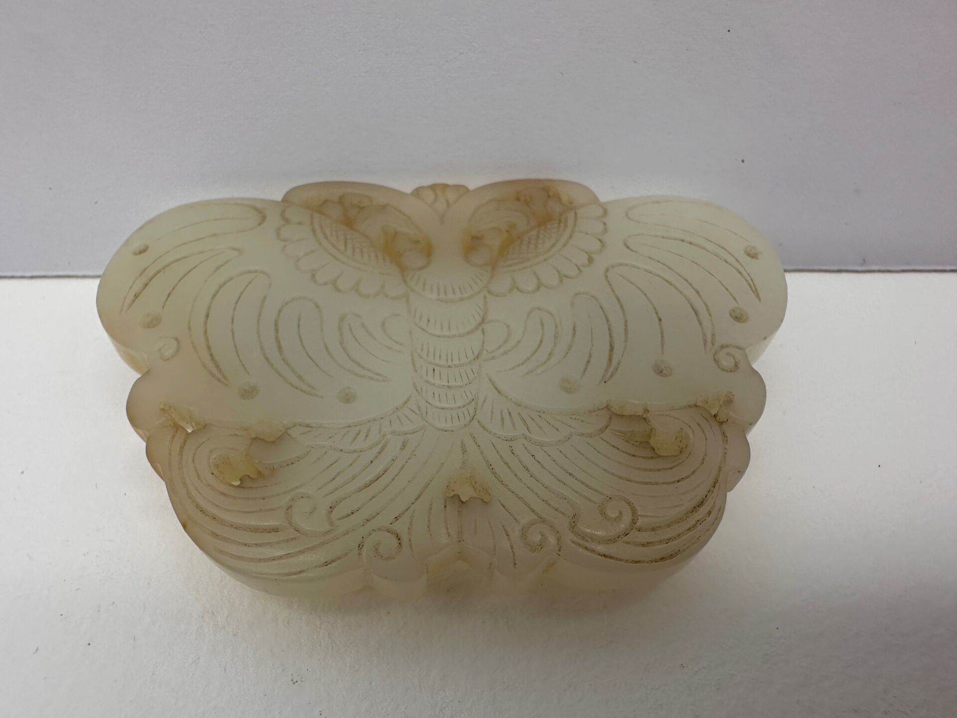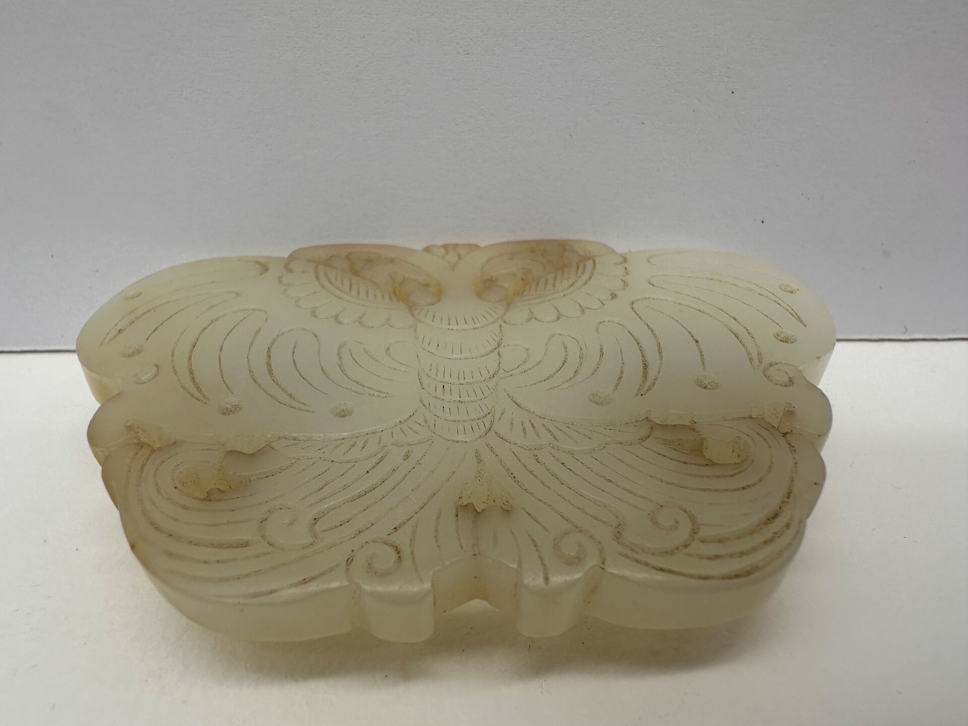 A white jade belt buckle depicting a butterfly with outstretched wings.