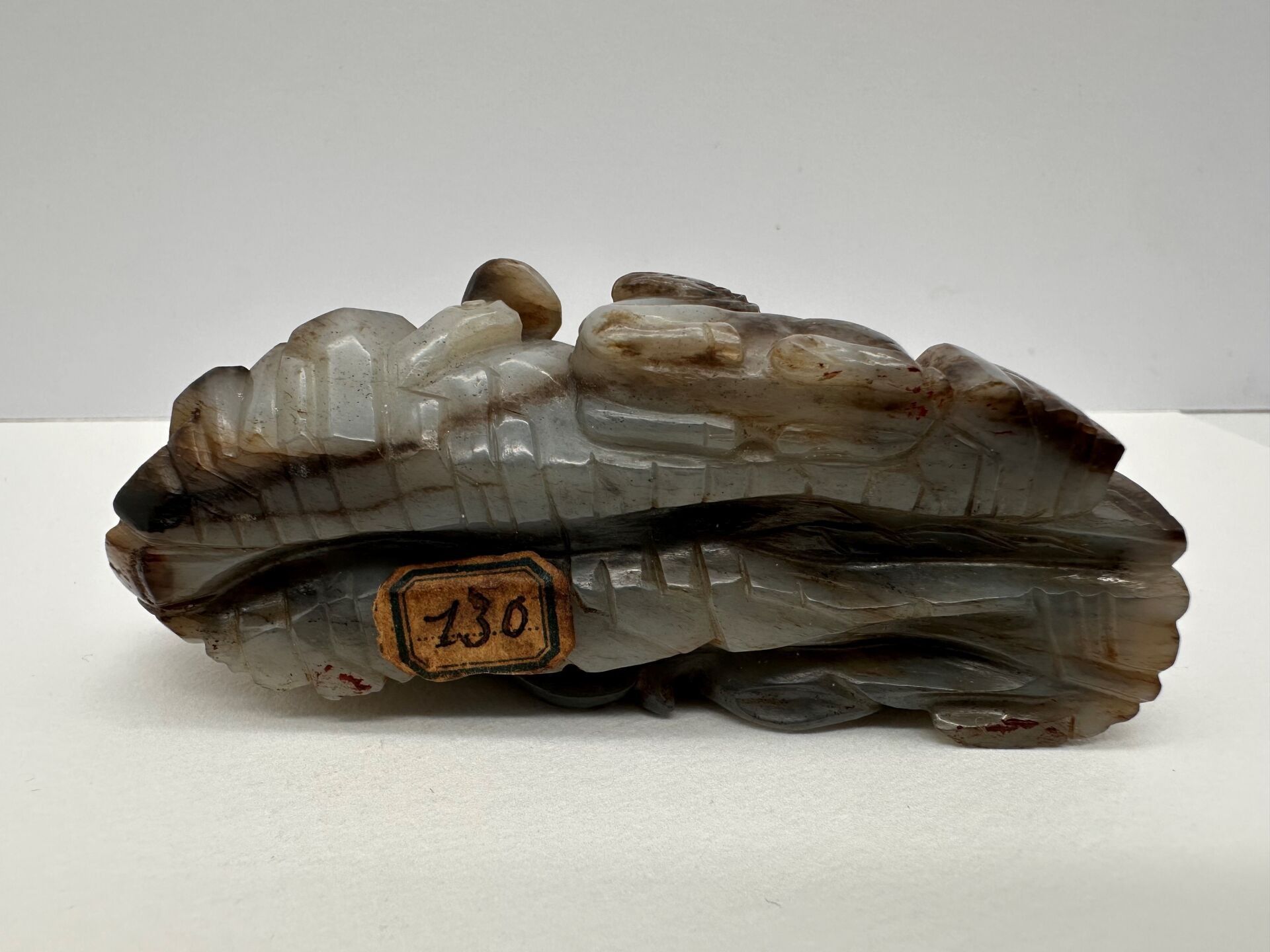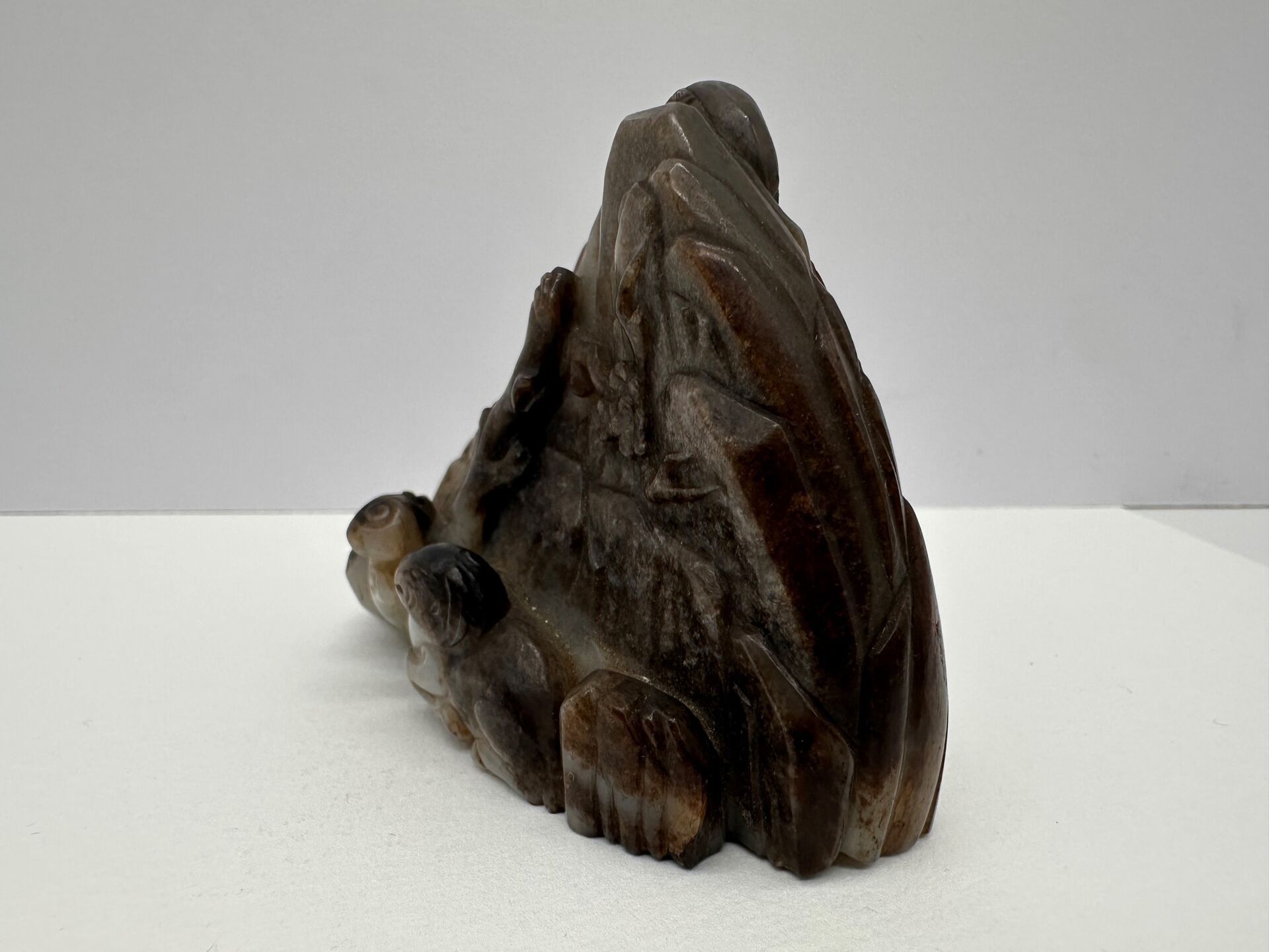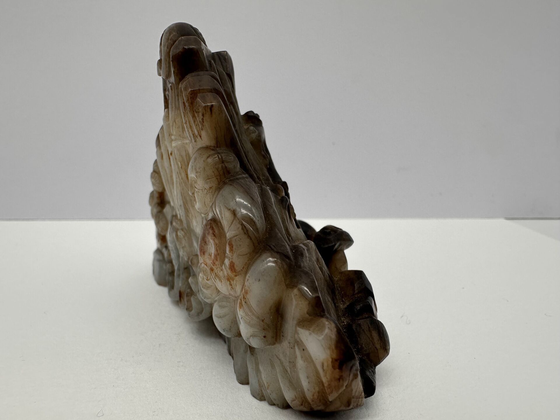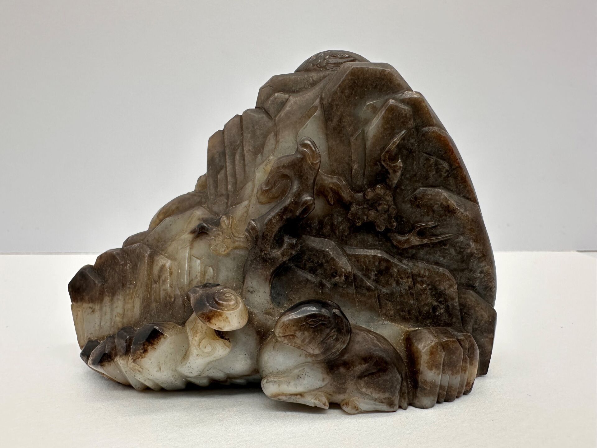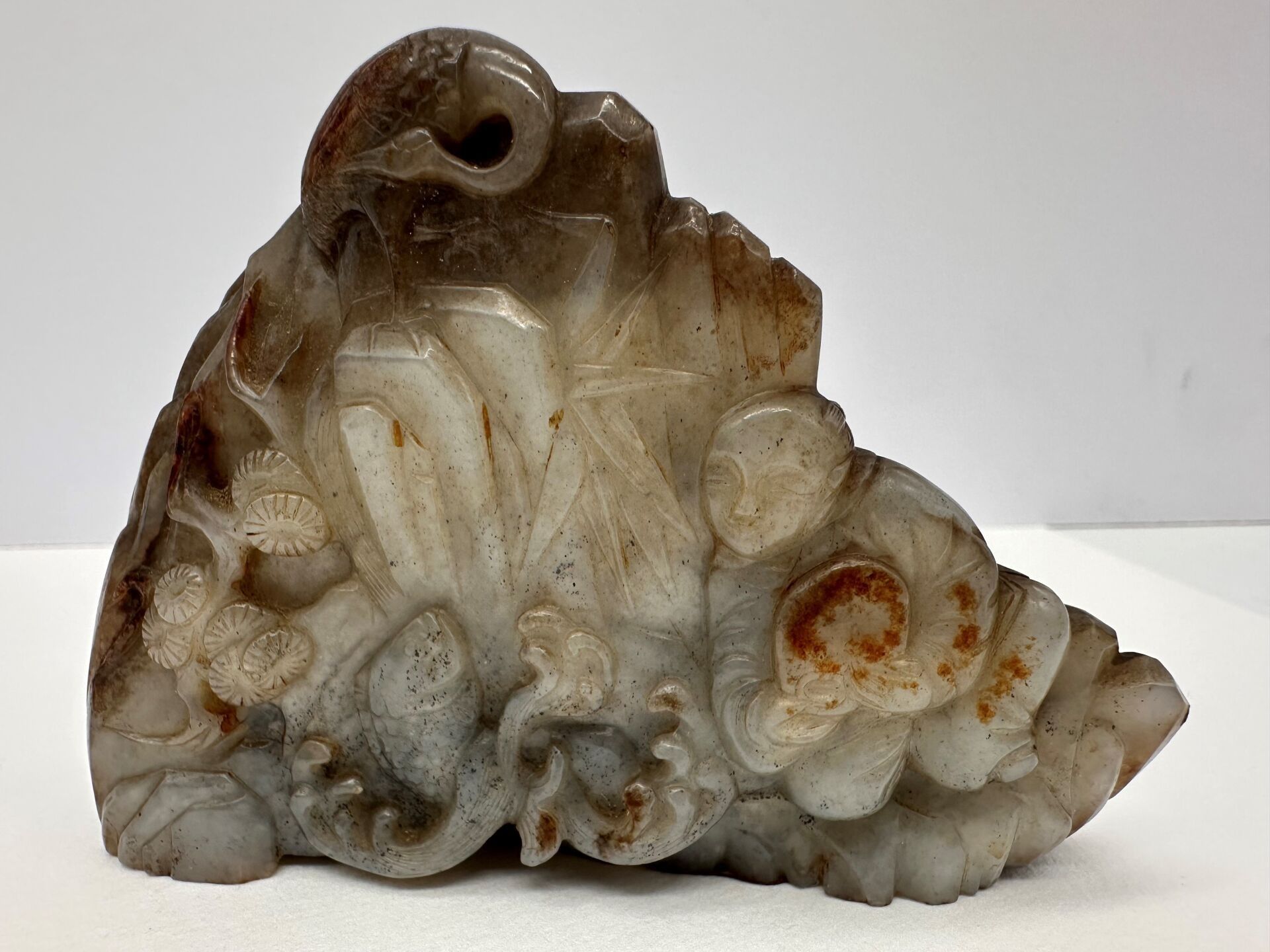 A brown-veined white jade group with two-sided decoration depicting a mountain planted with maples and longevity pines, near which a child is looking at a carp emerging from the water, with a crane in the upper part. The other side is carved with a ram reclining in front of a giant lingzhi.