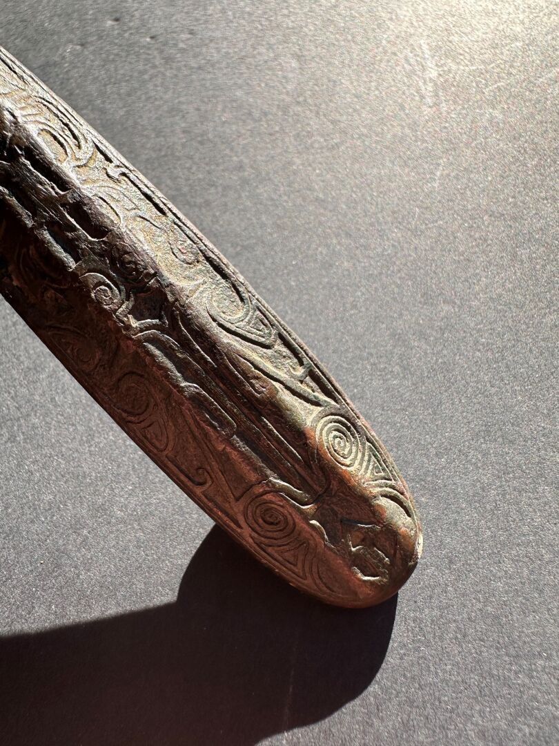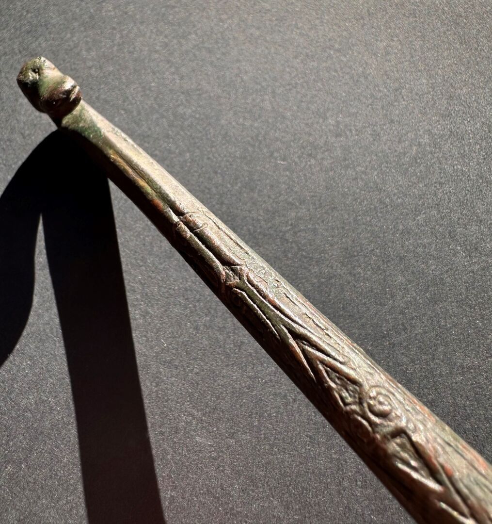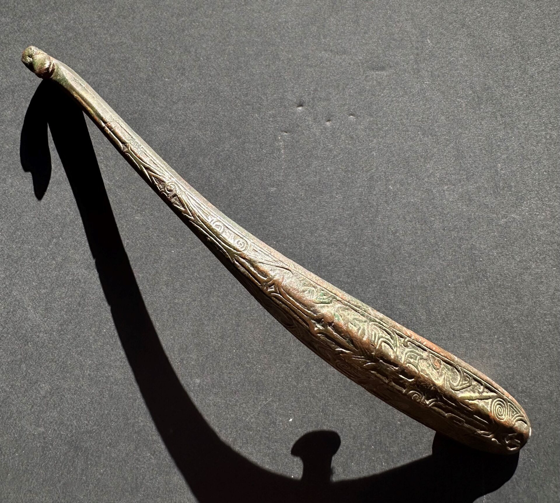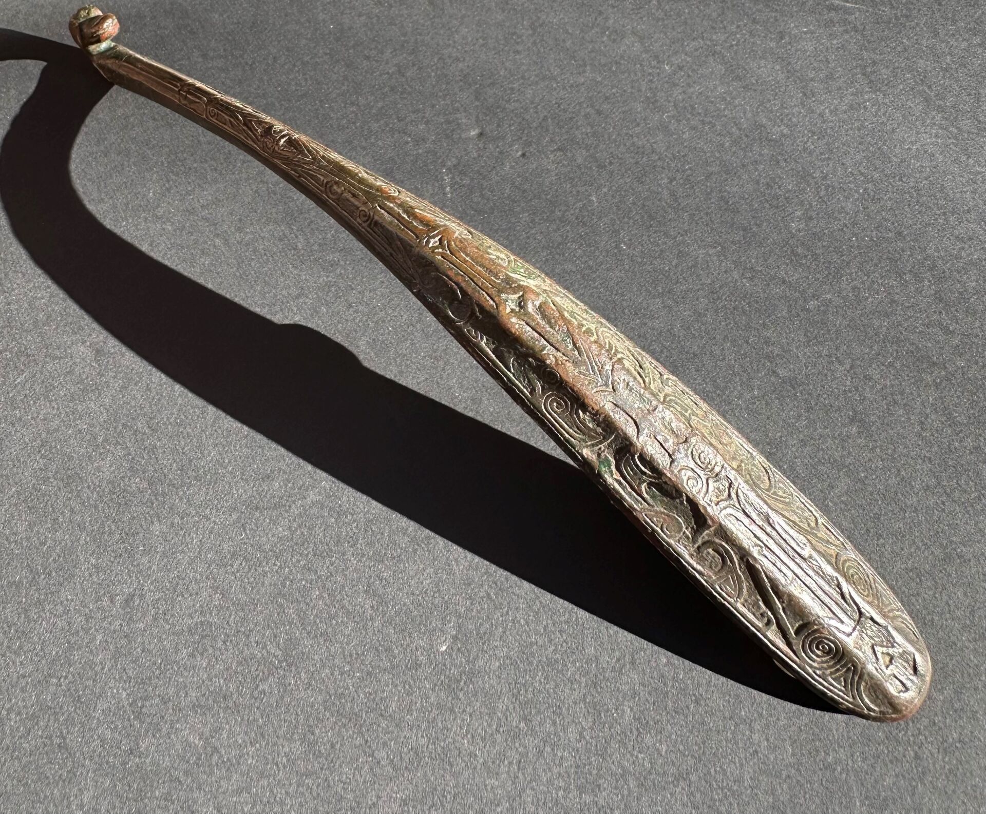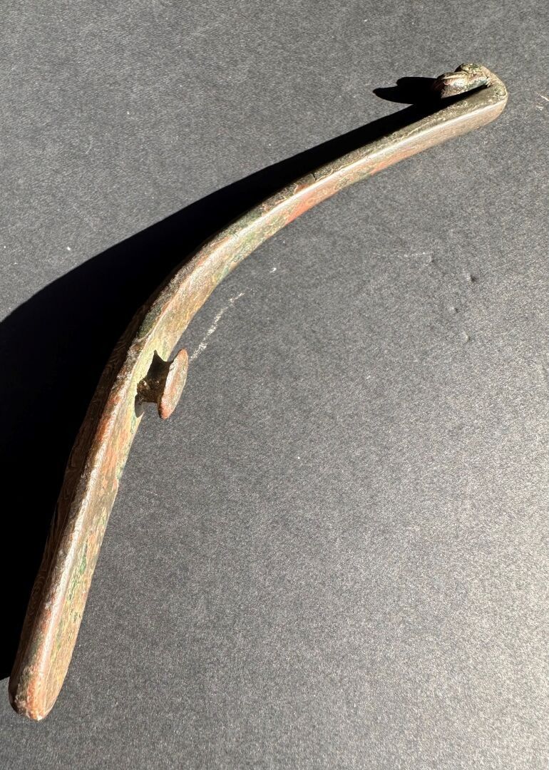 A bronze fibula with a beautiful green patina, decorated with a duck's head and plant motifs.