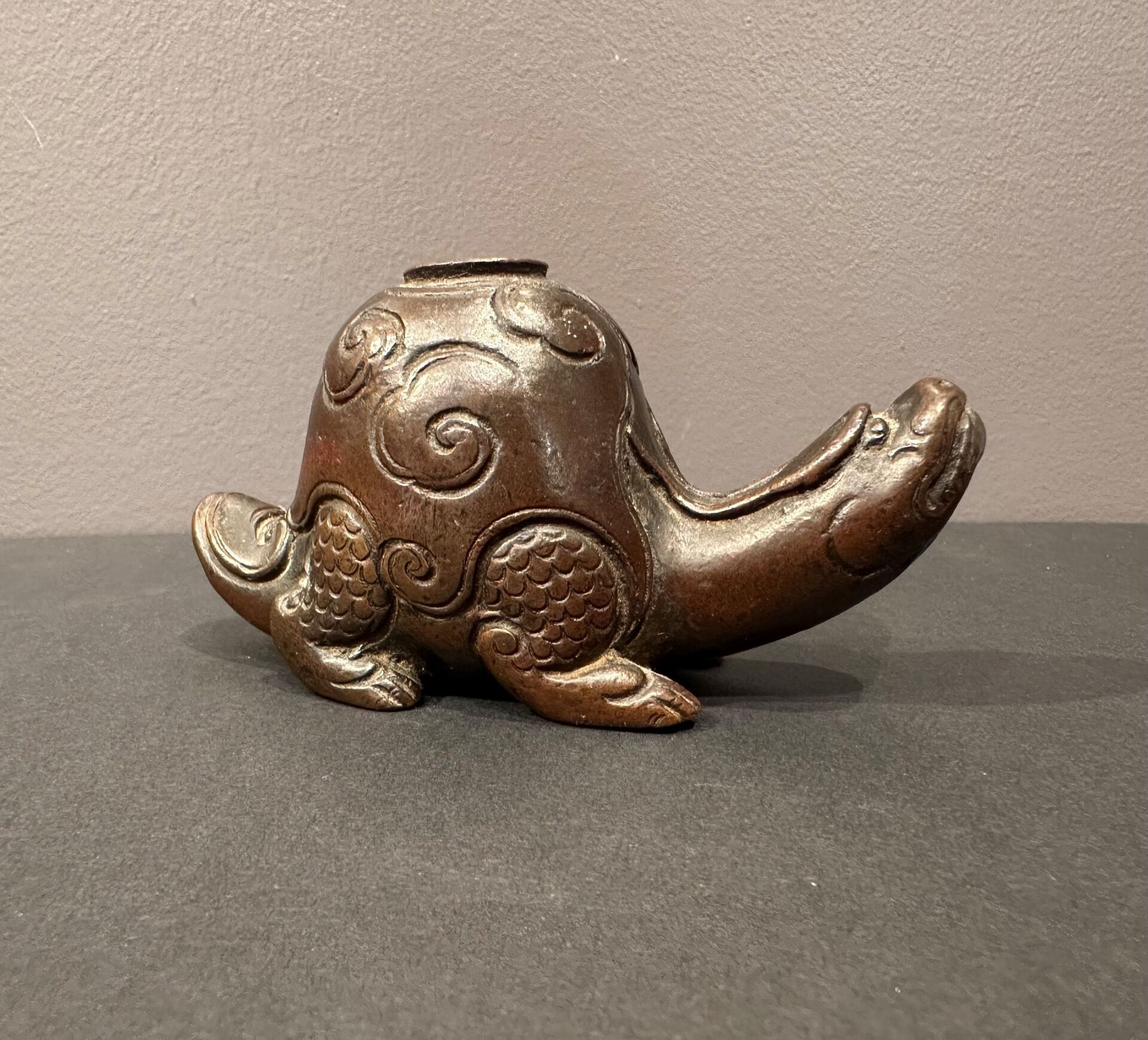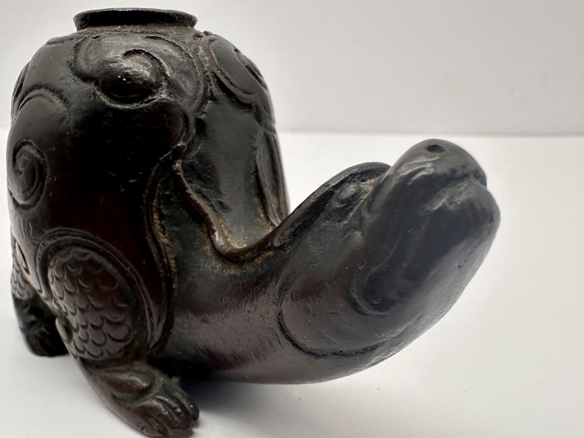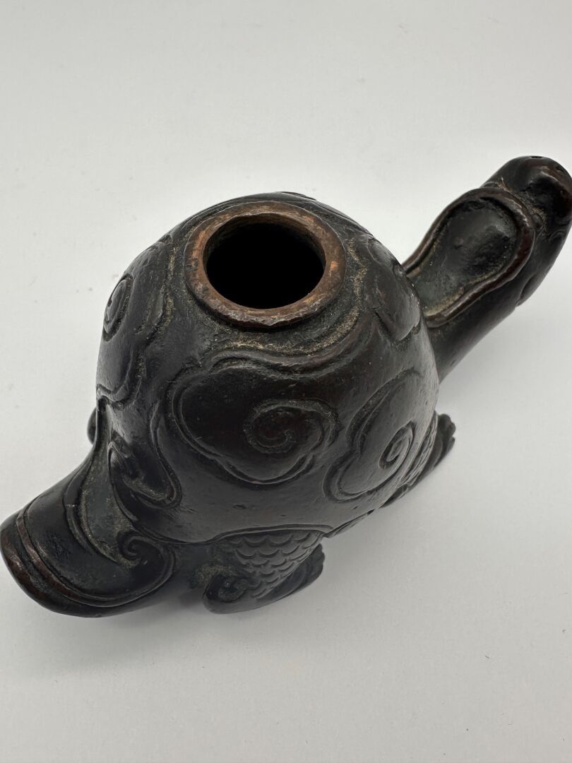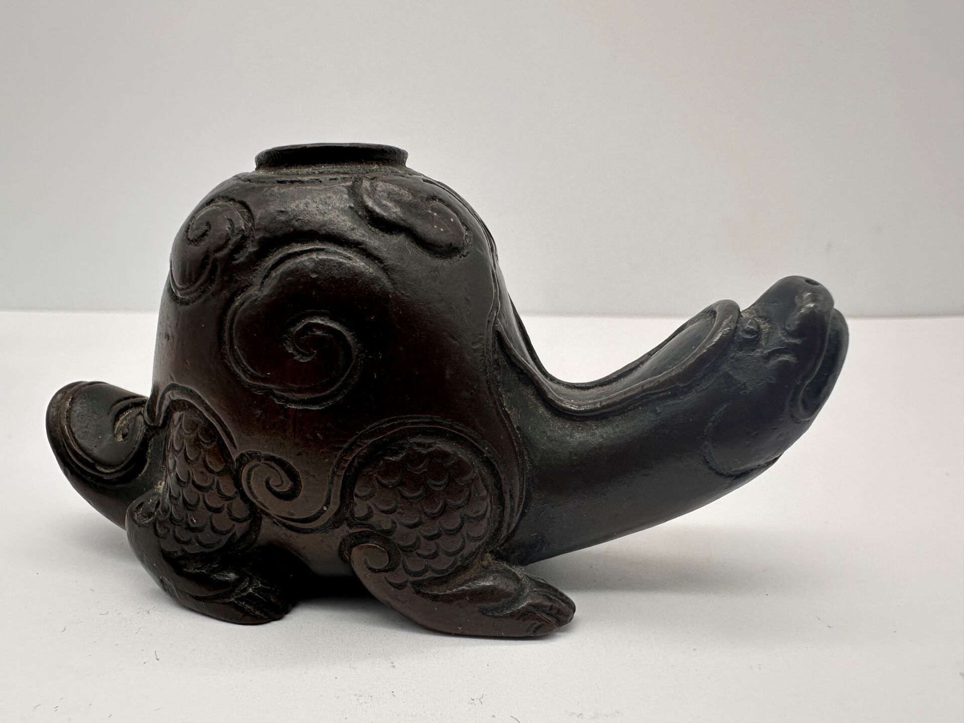 A bronze painter's cup with a beautiful light brown and red patina, in the shape of the Ao dragon.