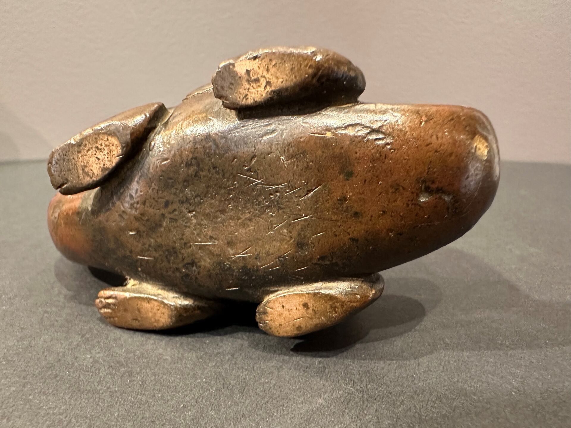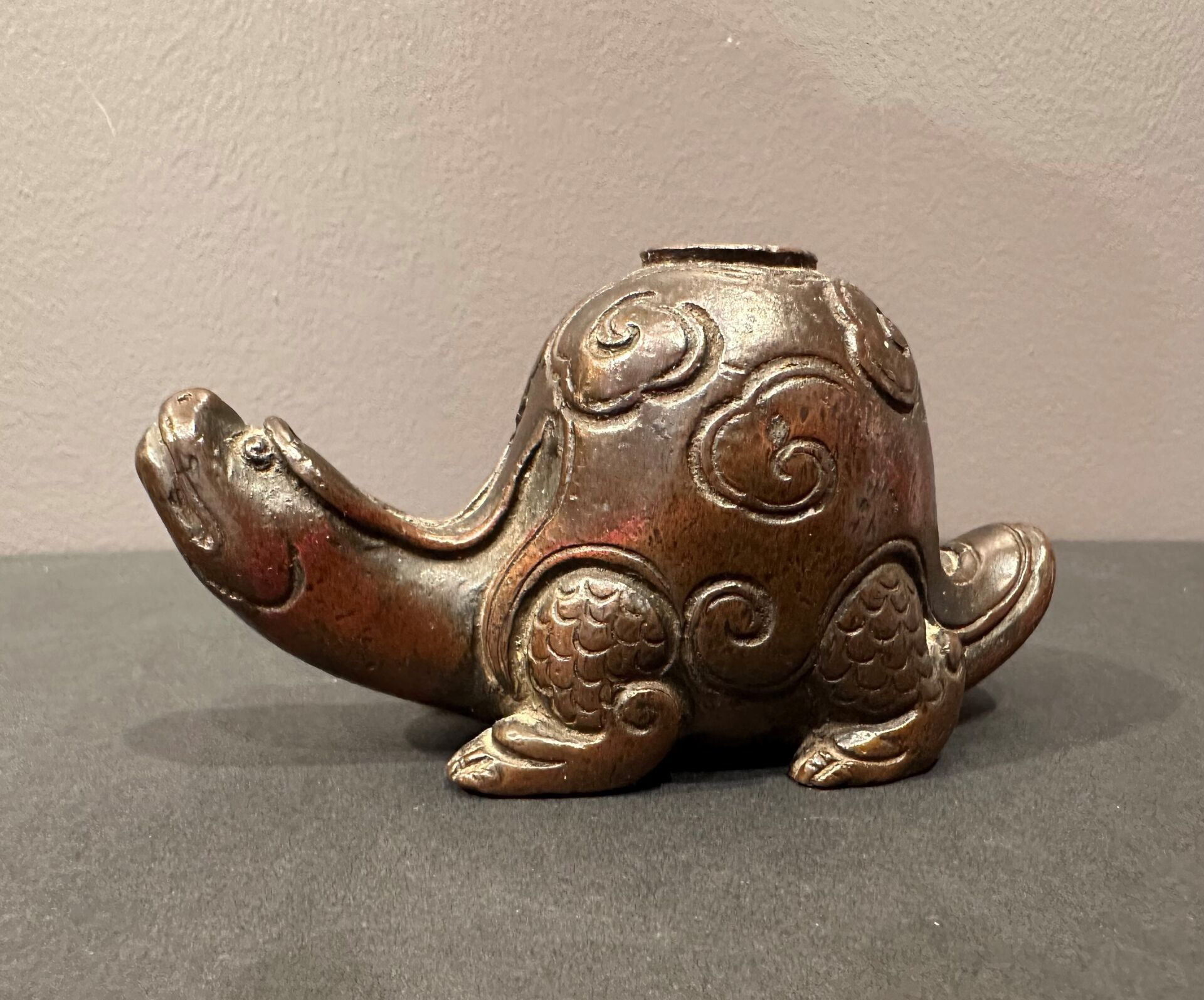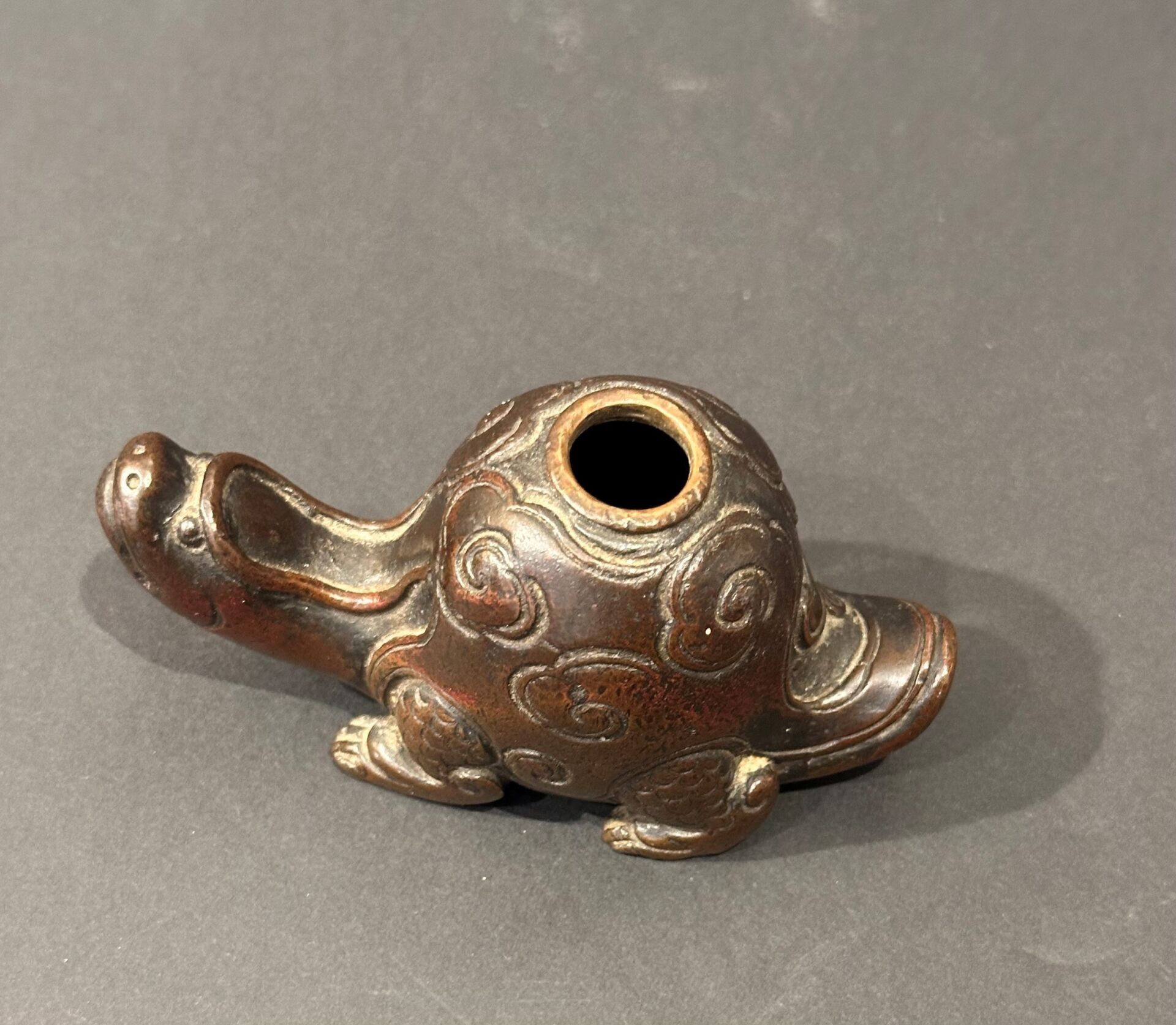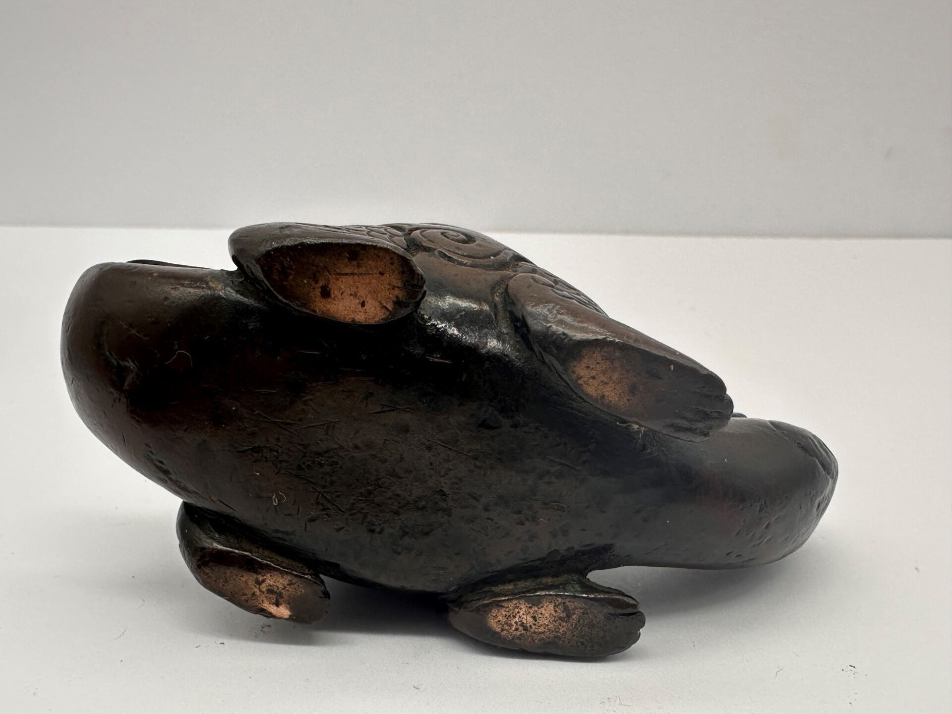 A bronze painter's cup with a beautiful light brown and red patina, in the shape of the Ao dragon.