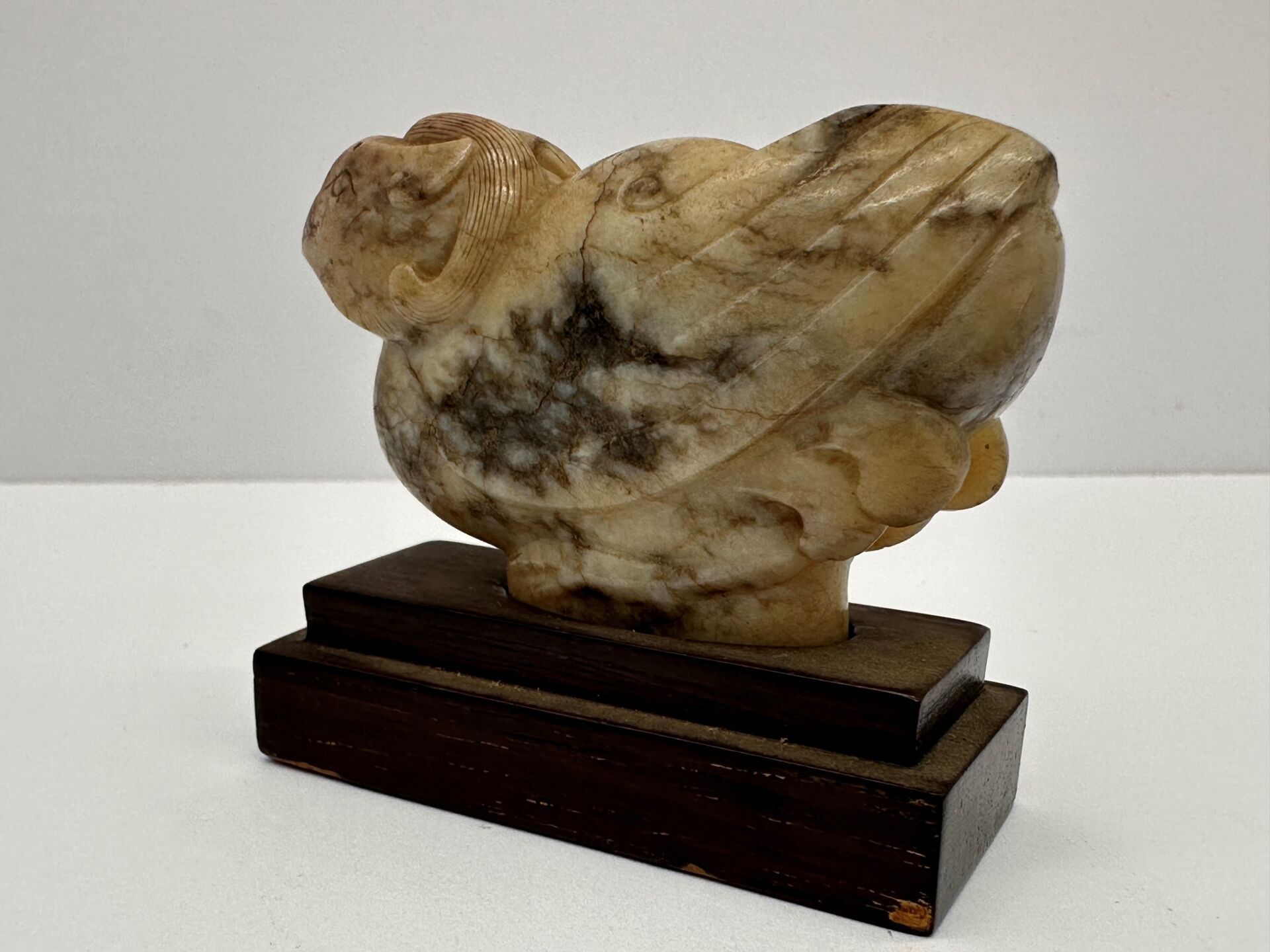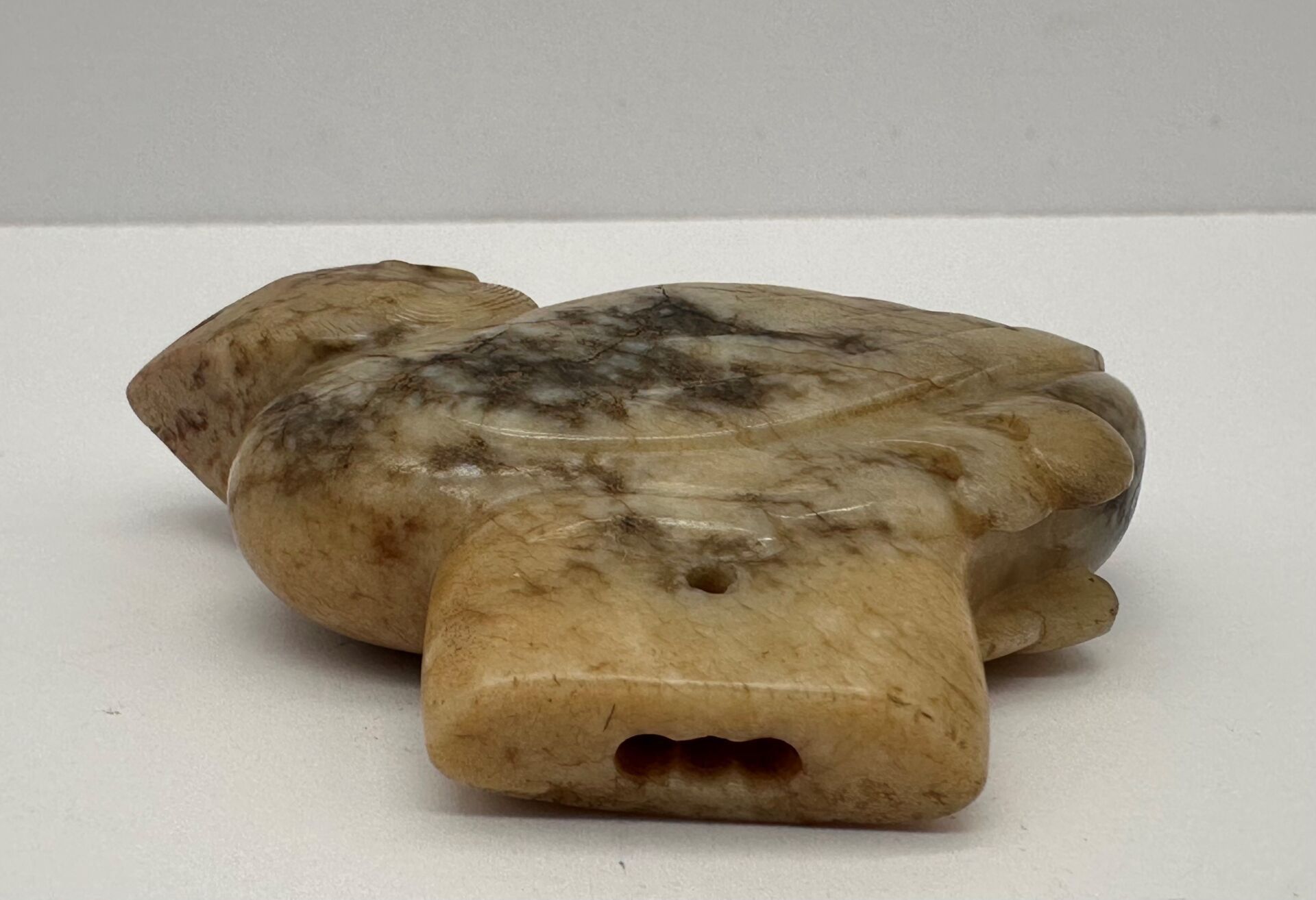 A jadeite statuette, slightly translucent and veined with rust, representing a pheasant.