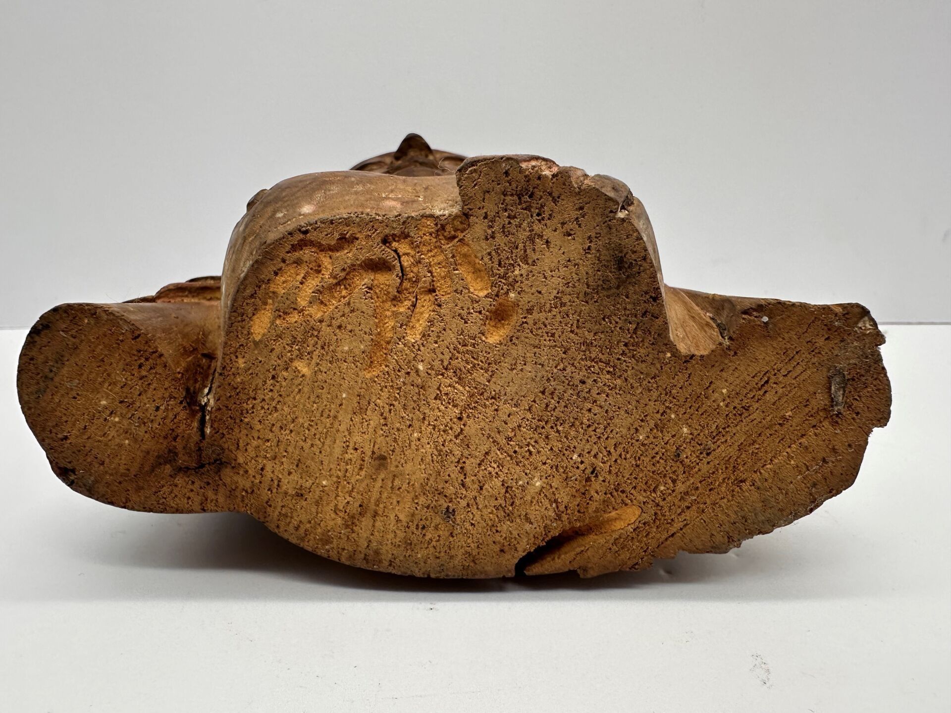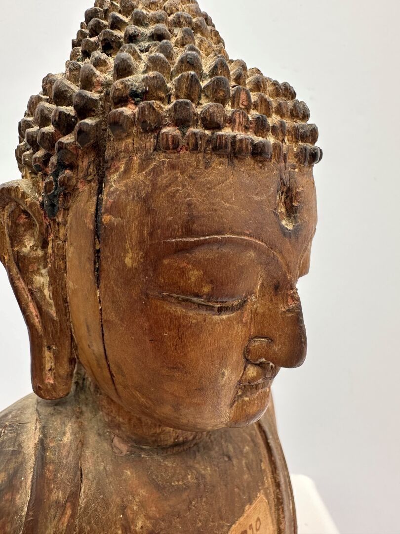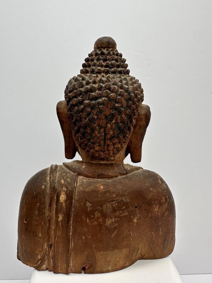 Buddha bust in Inaki wood, shoulders covered in monastic robes, face expressing serenity, topped with a bun.