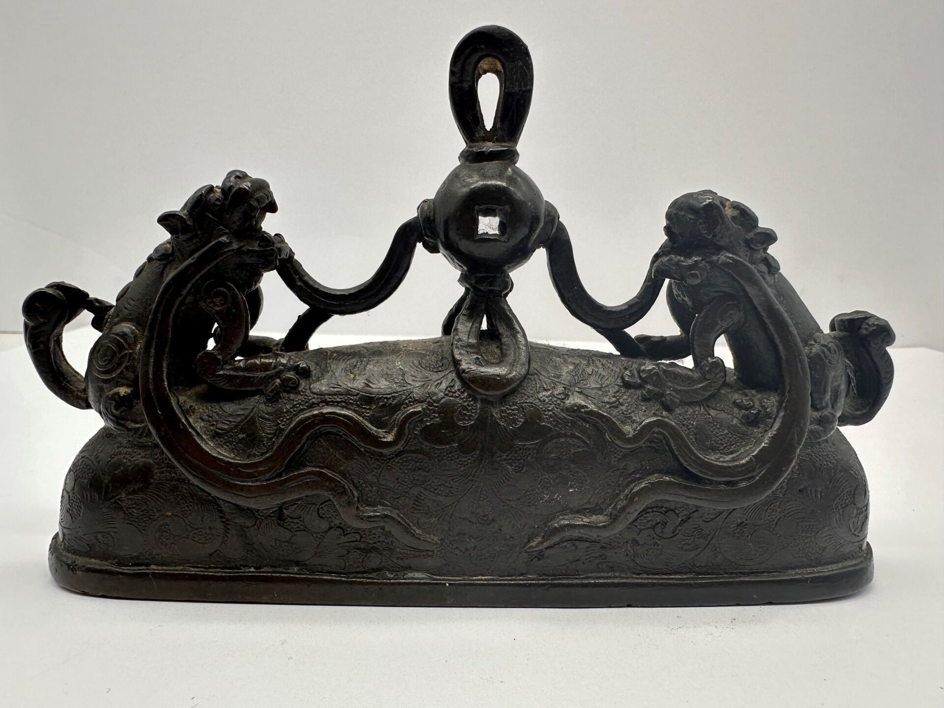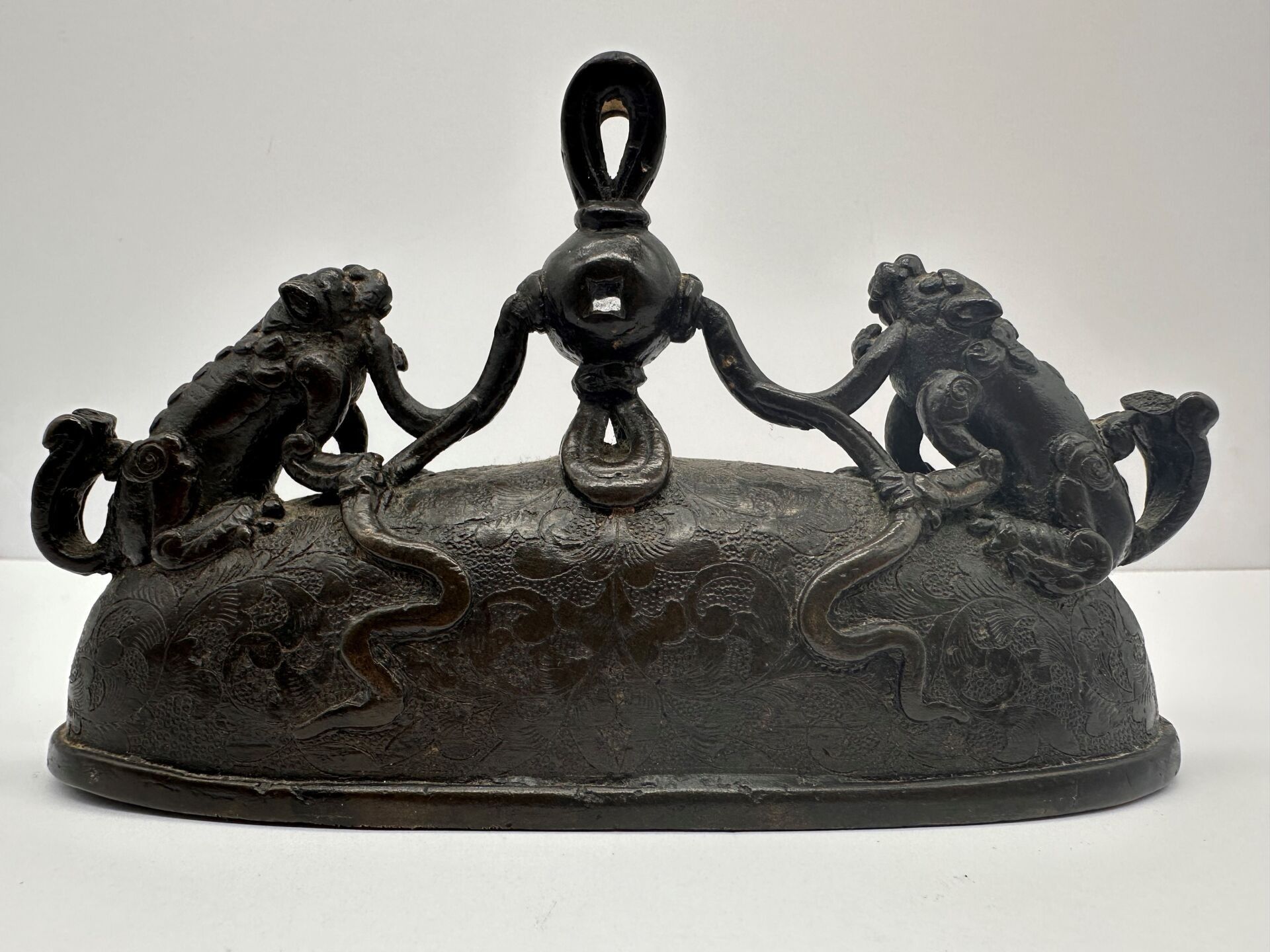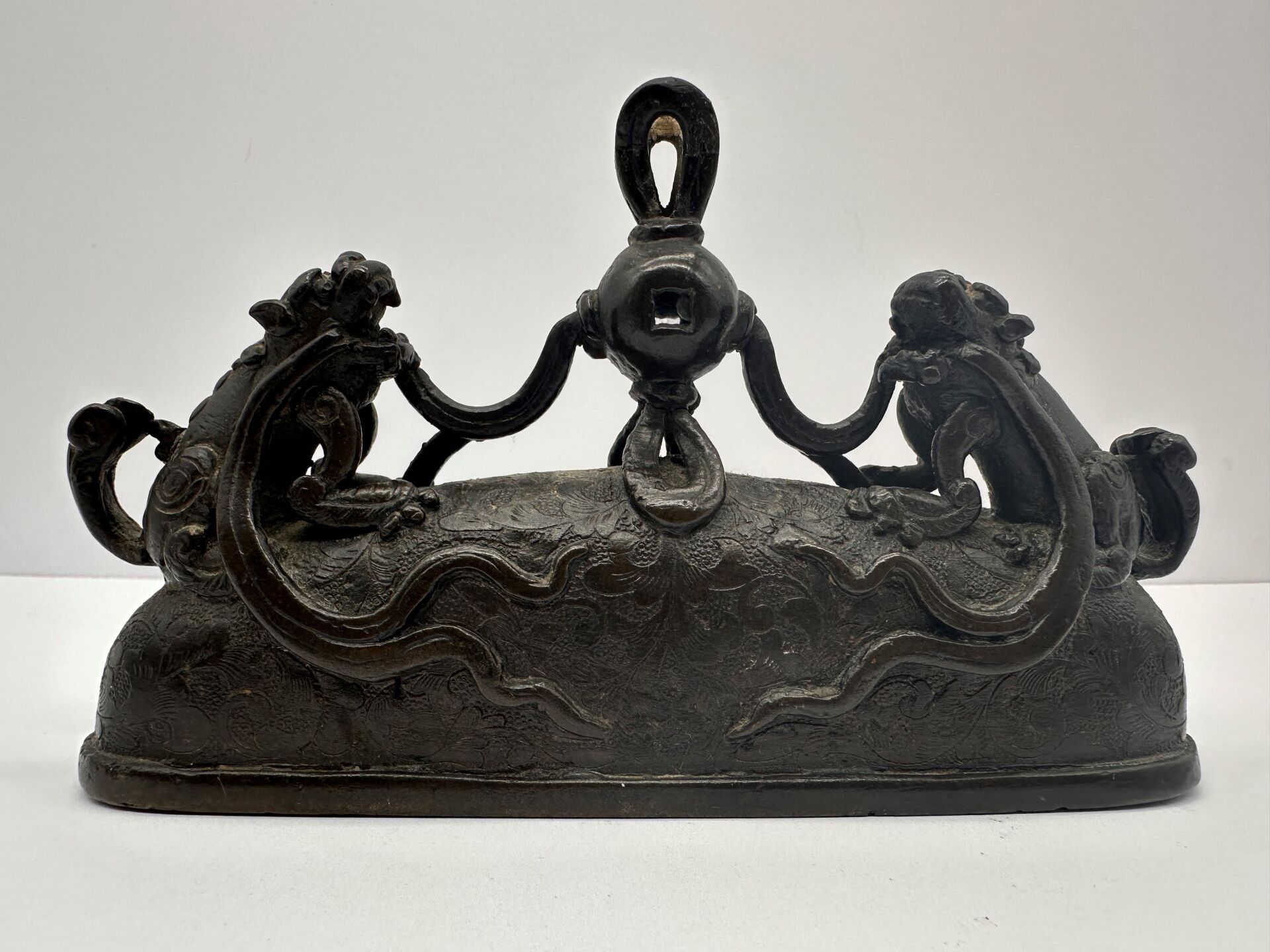 Brown patina bronze brush rest depicting a pair of Fô dogs holding ribbons in their mouths surrounding the sacred jewel. The scene unfolds above flowers and foliage.